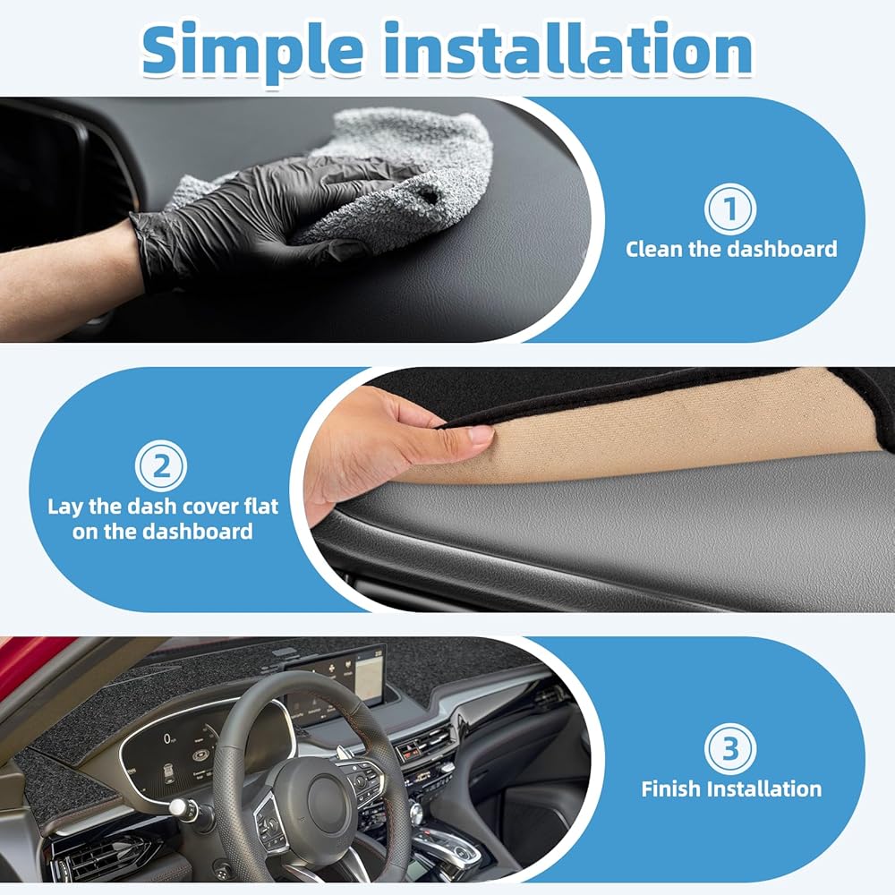 سهلة التركيب: تم تشكيل سجادة غطاء لوحة القيادة الخاصة بنا وتصميمها بناءً على بيانات طراز السيارة الأصلية. لا تتطلب جزيئات السيليكون عالية الكثافة المضادة للانزلاق في الأسفل أي أدوات أو مواد لاصقة أثناء التثبيت. فقط ضع غطاء لوحة القيادة مباشرة على الجزء العلوي من لوحة القيادة، ولن يتحرك.