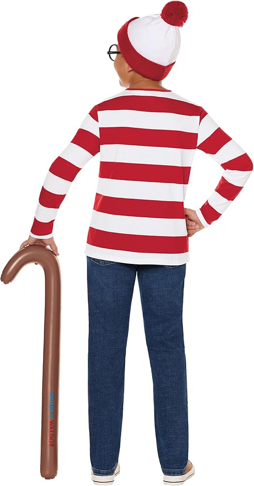 This Where's Waldo Costume Kit is the ultimate Halloween disguise. Featuring a red and white striped shirt, hat, round glasses, and cane, in this costume you'll look like you jumped right off the pages of any Where's Waldo book.