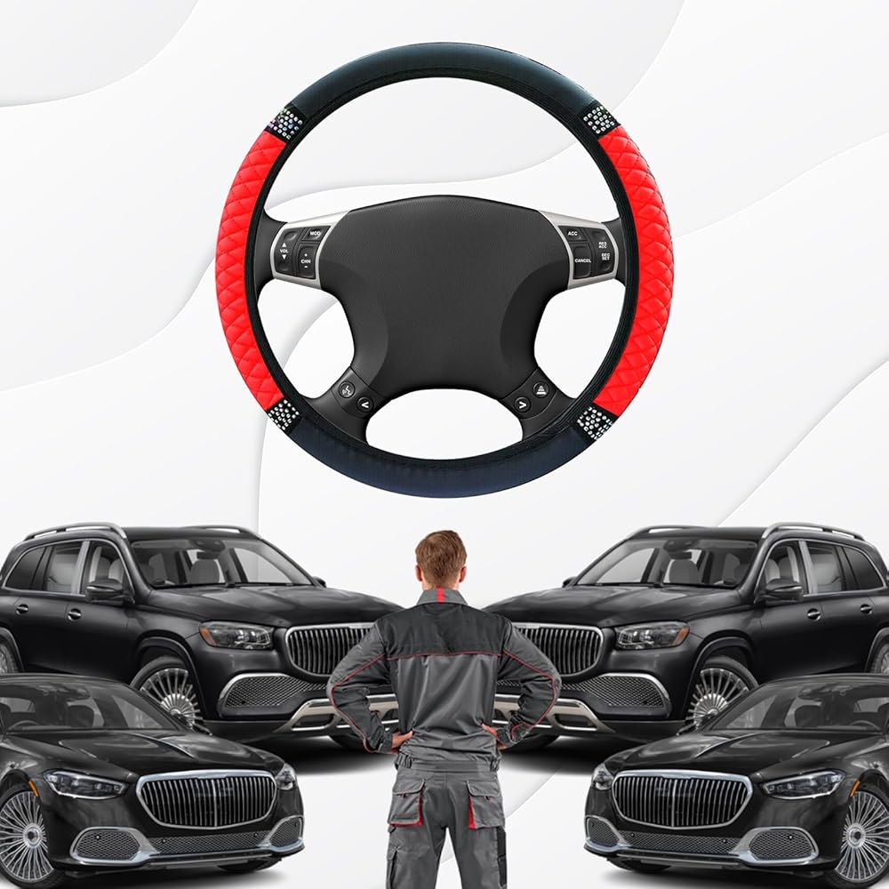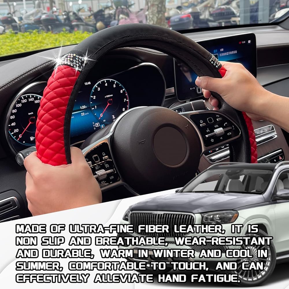 Microfiber Leather:Bling steering wheel cover is made of fine and soft microfiber PU leather, which is soft and breathable, comfortable to the touch, waterproof and anti-slip, relieves your driving fatigue, prevents scratches, wear and tear, and protects your steering wheel cover to look like new