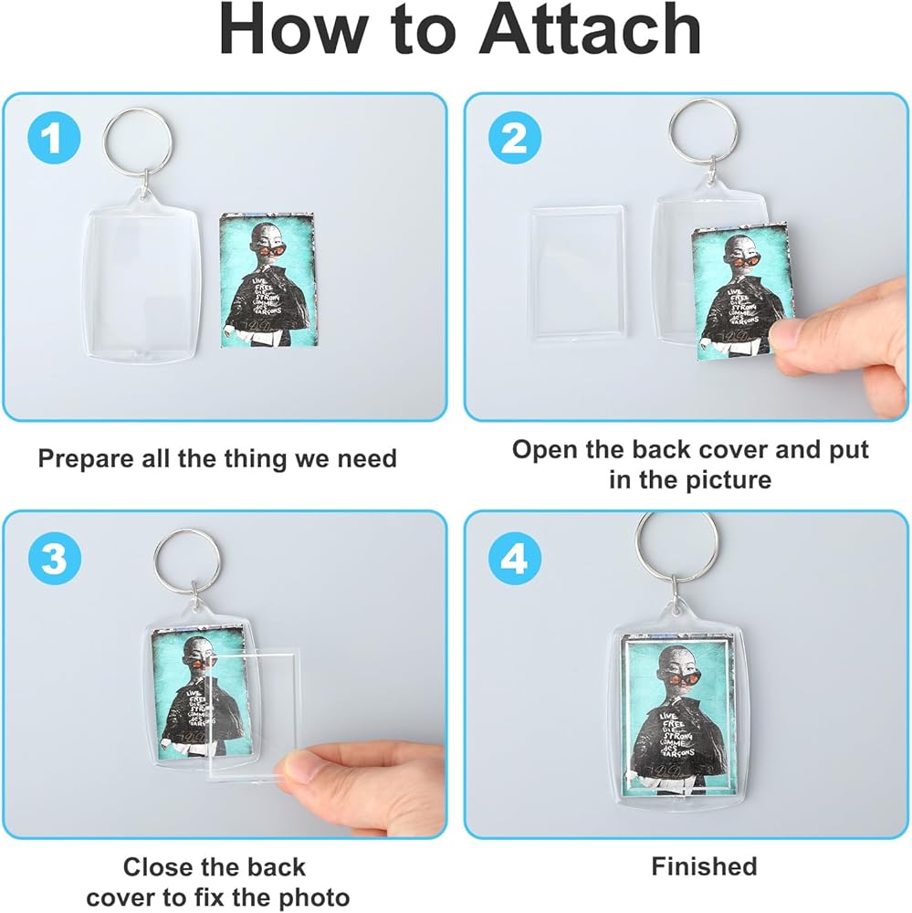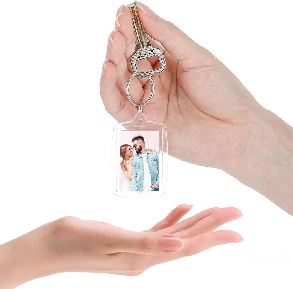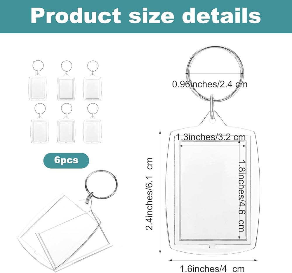 • 6-Pack Clear Acrylic Keychain Blanks: Create your own unique personalized keychain with this versatile set. Each acrylic keychain blank features a keychain ring and is designed to hold a 1.7" x 1.1" photo, making it the perfect photo keychain or picture keychain gift.