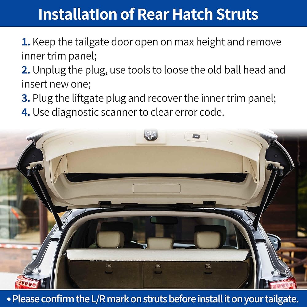 [كيفية التثبيت] 1. أبقِ باب البوابة الخلفية مفتوحًا على أقصى ارتفاع وقم بإزالة لوحة الزخرفة الداخلية؛ 2. افصل القابس، واستخدم الأدوات لفك الوصلة الكروية القديمة وإدخال وصلة جديدة؛ 3. قم بتوصيل قابس باب صندوق الأمتعة واستعادة لوحة الكسوة الداخلية؛ 4. استخدم الماسح الضوئي التشخيصي لمسح رمز الخطأ، فقط استخدم الماسح الضوئي لمسح ما إذا كان العرض سلبيًا/عرضيًا؛ استبدل دعامات الرفع إذا كانت دائمة. قم بتأكيد علامة L/R الموجودة على الدعامات قبل تثبيتها على الباب الخلفي.