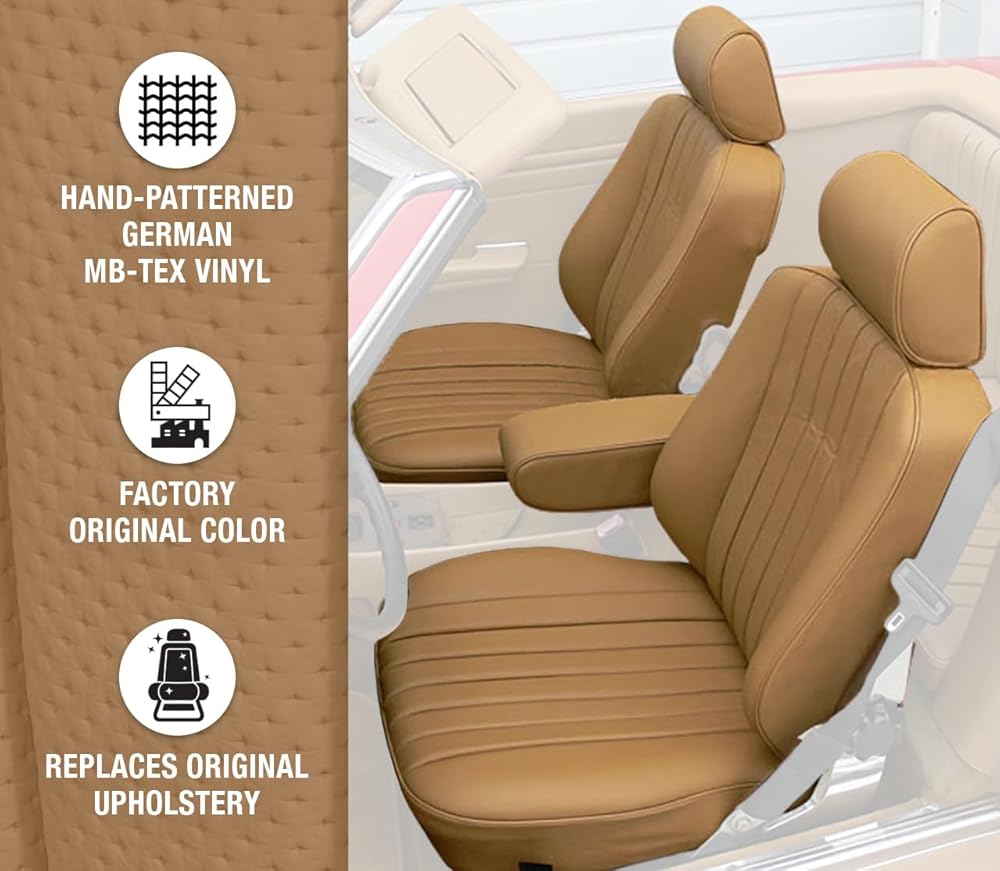 PALOMINO VINYL MATERIAL - German MB Tex vinyl with correct color, grain, and embossing original to Mercedes preserving the life and look of your vehicle seat covers for years to come. Matches exact color, weight, and grain original to Mercedes.