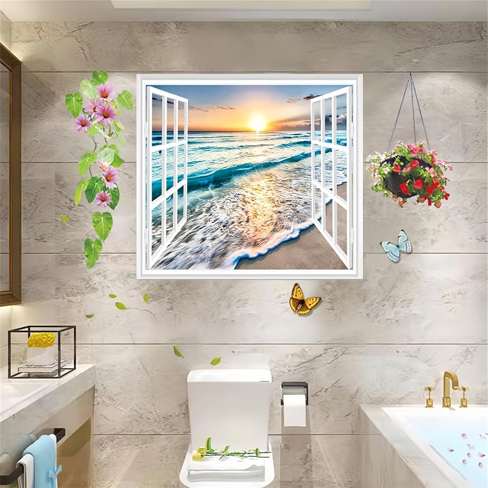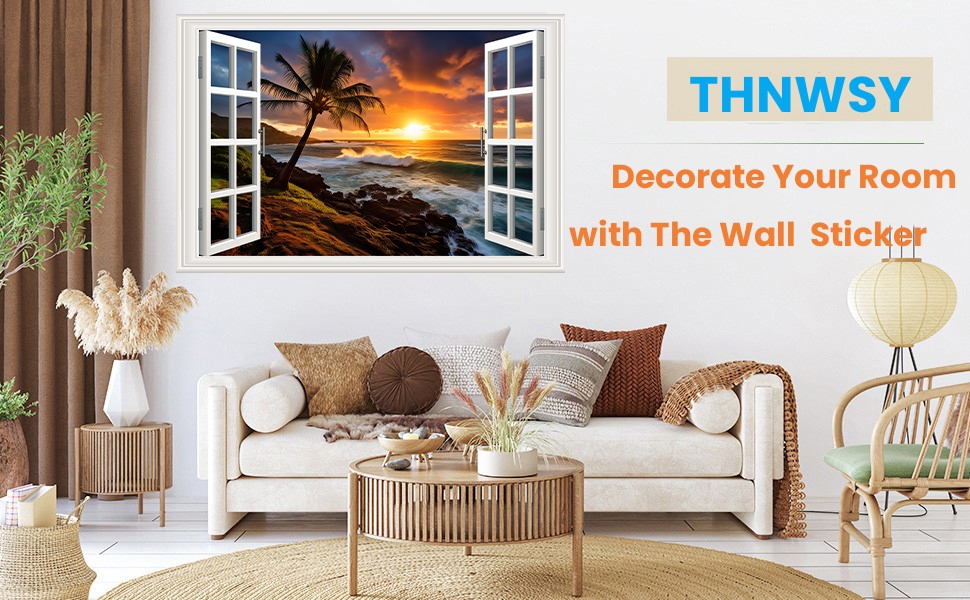 قطعتان من ملصقات الحائط للنافذة المزيفة ذاتية اللصق ثلاثية الأبعاد على شكل جزيرة استوائية مع أشجار النخيل، لوحة جدارية لديكور المنزل (شجرة كبيرة + منظر طبيعي، 17.3 بوصة × 27.6 بوصة)