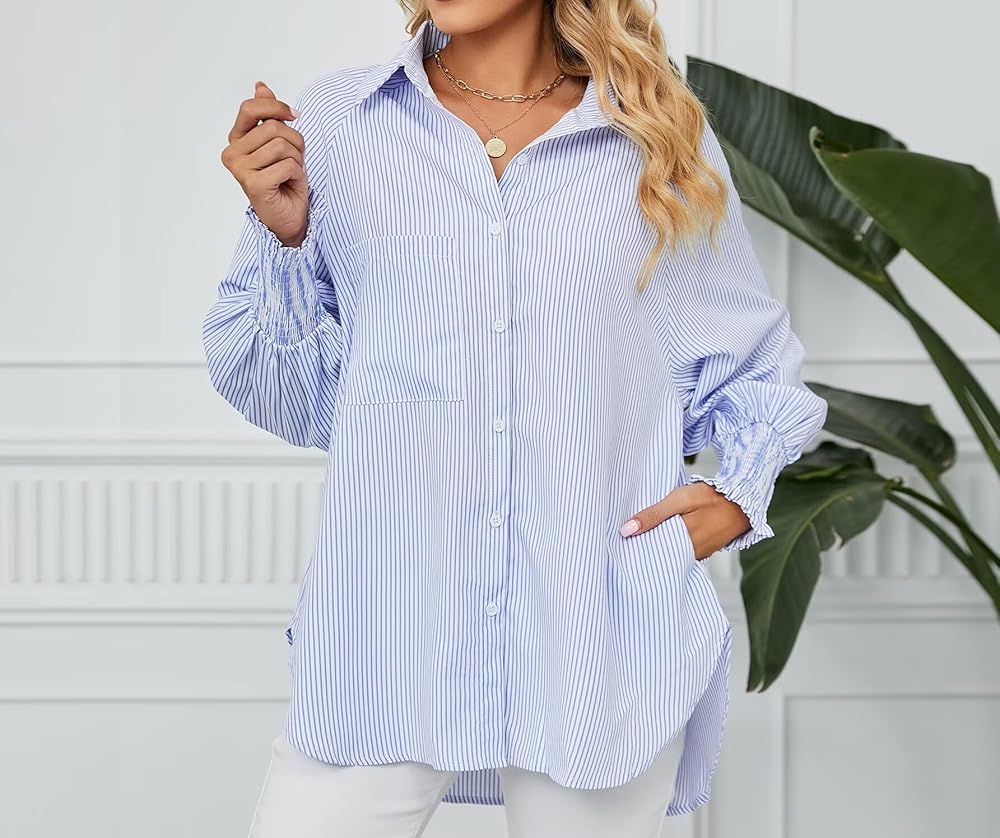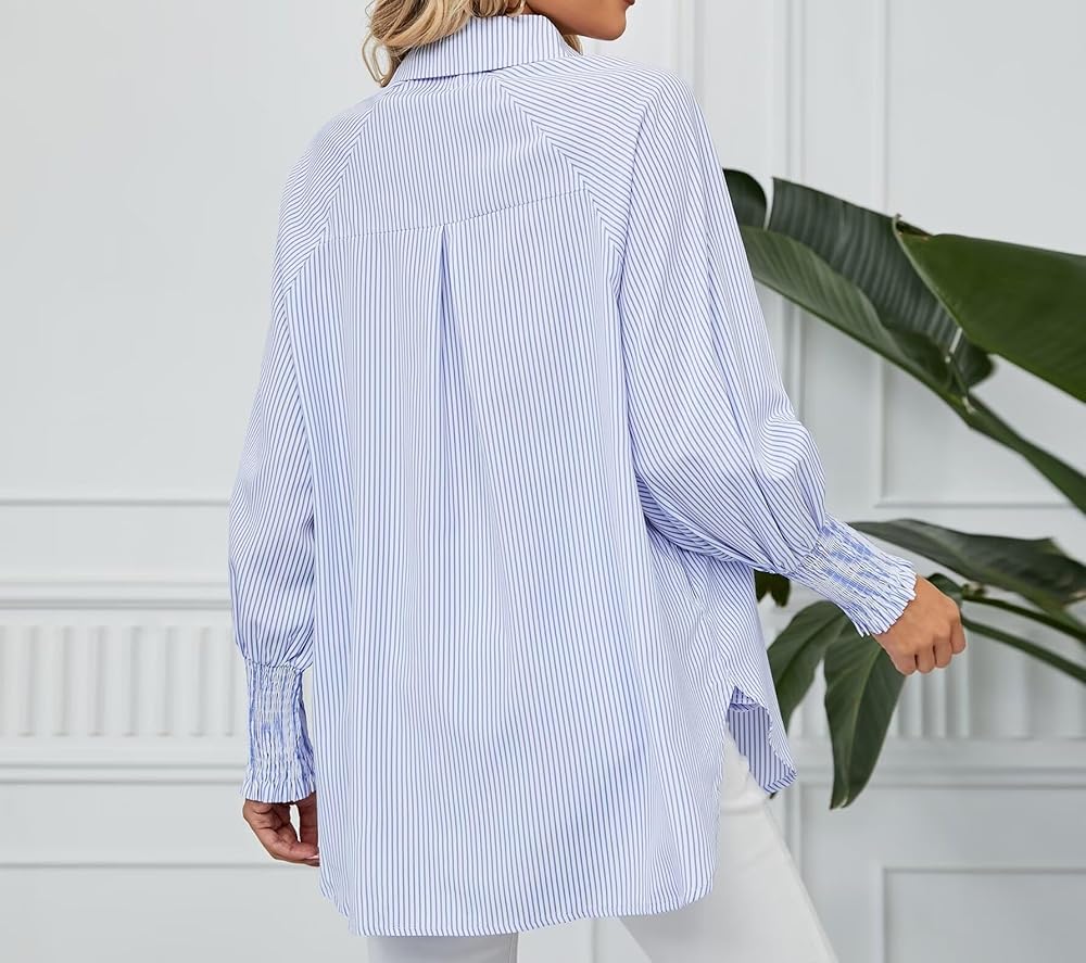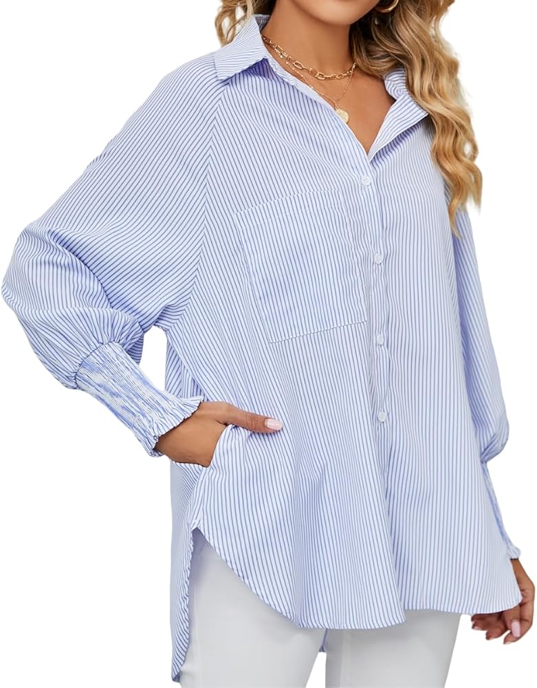 السمات: ياقة مطوية مريحة، وأساور أكمام قابلة للتعديل، ونمط مخطط مرح. مقاس صديقها الكبير ينزلق على الجسم للحصول على صورة ظلية نحيفة بمهارة، بينما يضيف جيب الصدر العملي وإغلاق الزر الأمامي عملية إلى هذا القميص الأنيق.