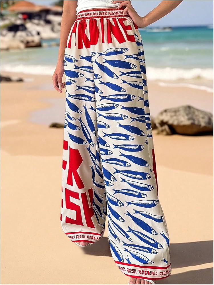 MakeMeChic Women's Boho Fish Print Wide Leg Pants Elastic Waist Loose Fit Trousers with Pockets