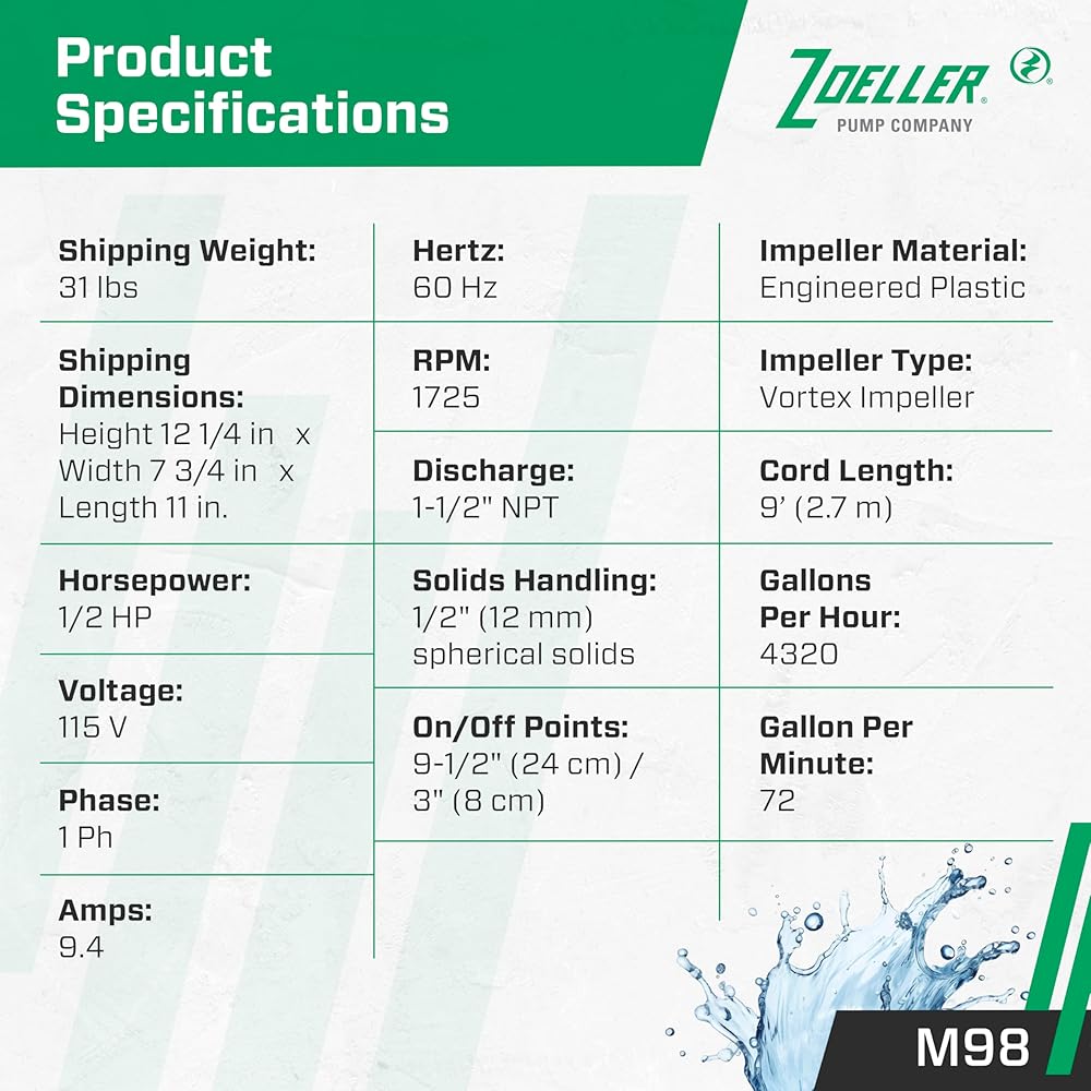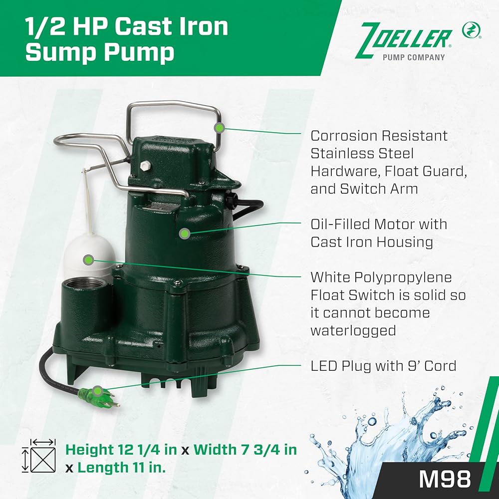 تتميز مضخة Zoeller's Flow-Mate Model M98 من الحديد الزهر الغاطسة/مضخة النفايات السائلة بمحرك من الحديد الزهر وغطاء للمضخة، وعلبة مفاتيح من الحديد الزهر، وقاعدة من الحديد الزهر. جميع المسبوكات مصنوعة من حديد الزهر فئة 25-30 بقوة شد 25000#. يتميز الطراز M98 أيضًا بمكره دوامي بلاستيكي مصمم هندسيًا. يتميز Flow-Mate بطبقة نهائية من الإيبوكسي المطلي بمسحوق مقاوم للتآكل. لا توجد أجزاء من الصفائح المعدنية التي قد تصدأ أو تتآكل ولا توجد شاشات من شأنها أن تسد. المحرك ذو المكثف الانزلاقي الدائم مملوء بالزيت ومغلق بإحكام. يتميز بإعادة التشغيل التلقائي للحماية من الحمل الزائد الحراري. تشتمل المضخة أيضًا على حلقة مربعة من النيوبرين مقاومة للماء بين المحرك وغطاء المضخة. المحامل العلوية والسفلية للمضخة مصنوعة من الحديد الزهر الذي يتم تغذيته بالزيت. تبلغ درجة الحرارة القصوى لـ Flow-Mate للنفايات السائلة أو نزح المياه 130 درجة فهرنهايت. يتم اختبار الضغط على الوحدة بأكملها بعد التجميع. إن براغي المضخة، والحماية، والمقبض، والذراع ومجموعة الختم كلها مصنوعة من الفولاذ المقاوم للصدأ. يشتمل Flow-Mate على مفتاح ميكانيكي غاطس يعمل بالطفو (NEMA 6) ثنائي القطب. كما أنها تحتوي على ختم عمود من الكربون والسيراميك. تفريغ المضخة هو 1-1/2 بوصة NPT. العرض الرئيسي للطراز M98 هو 10-1/8 بوصة. الارتفاع الرئيسي هو 12 بوصة.