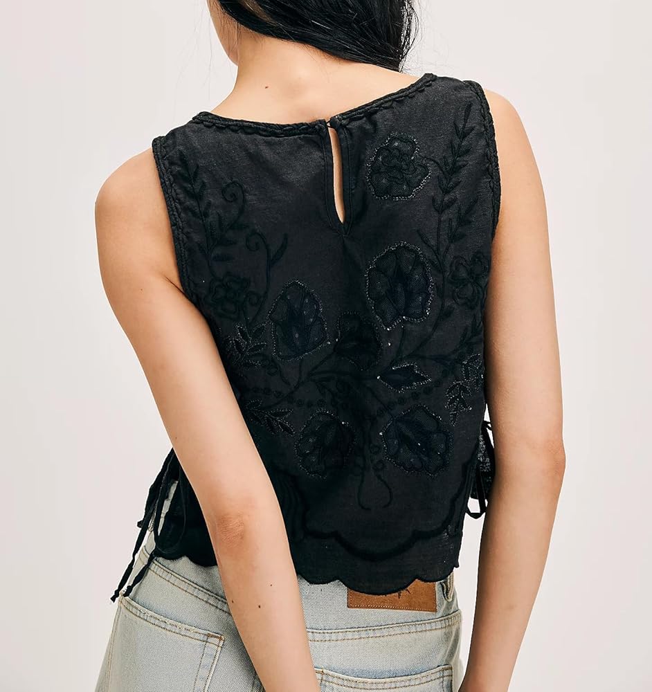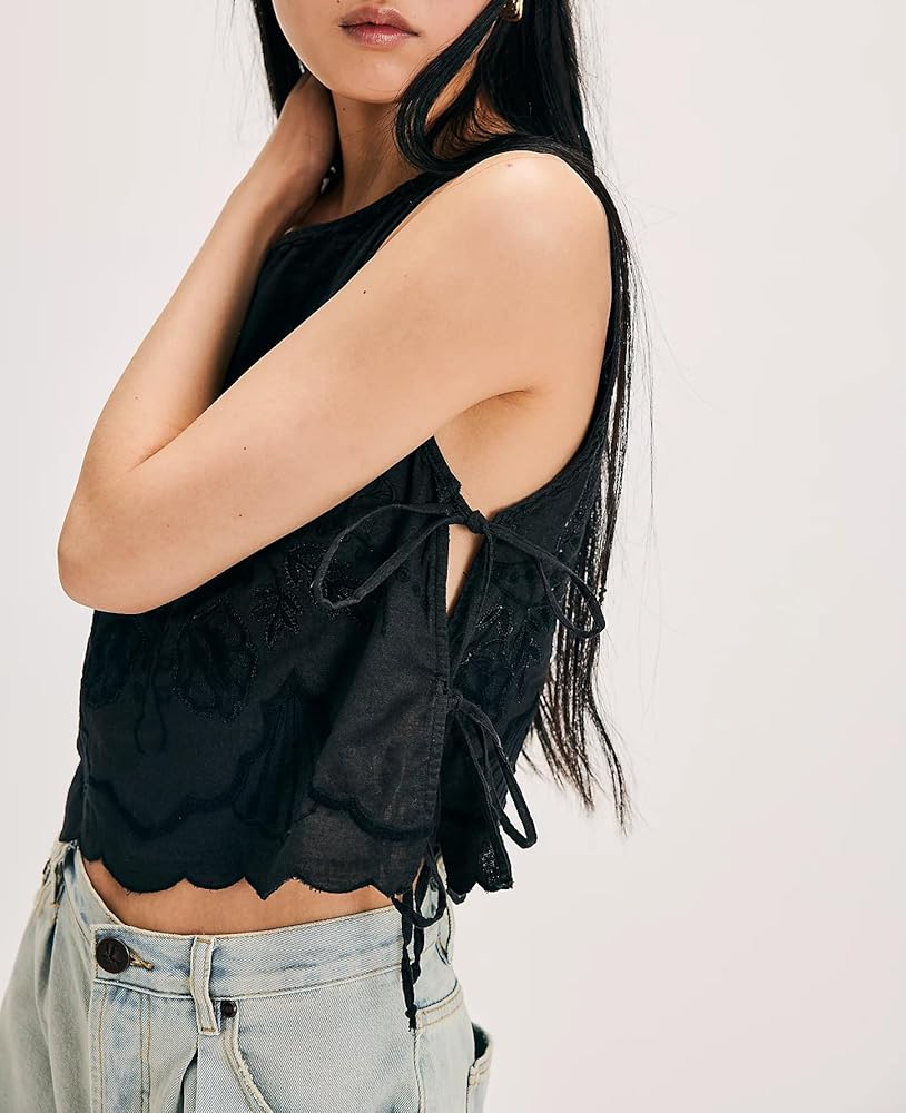 • Design: Summer women's tie side front slim fit camisole tank top vest y2k embroidered cute teen girls summer going out ruffle lace aesthetic boxy corset cami sleeveless streetwear shirts crop tops;Sleeveless backless low cut lace floral vest