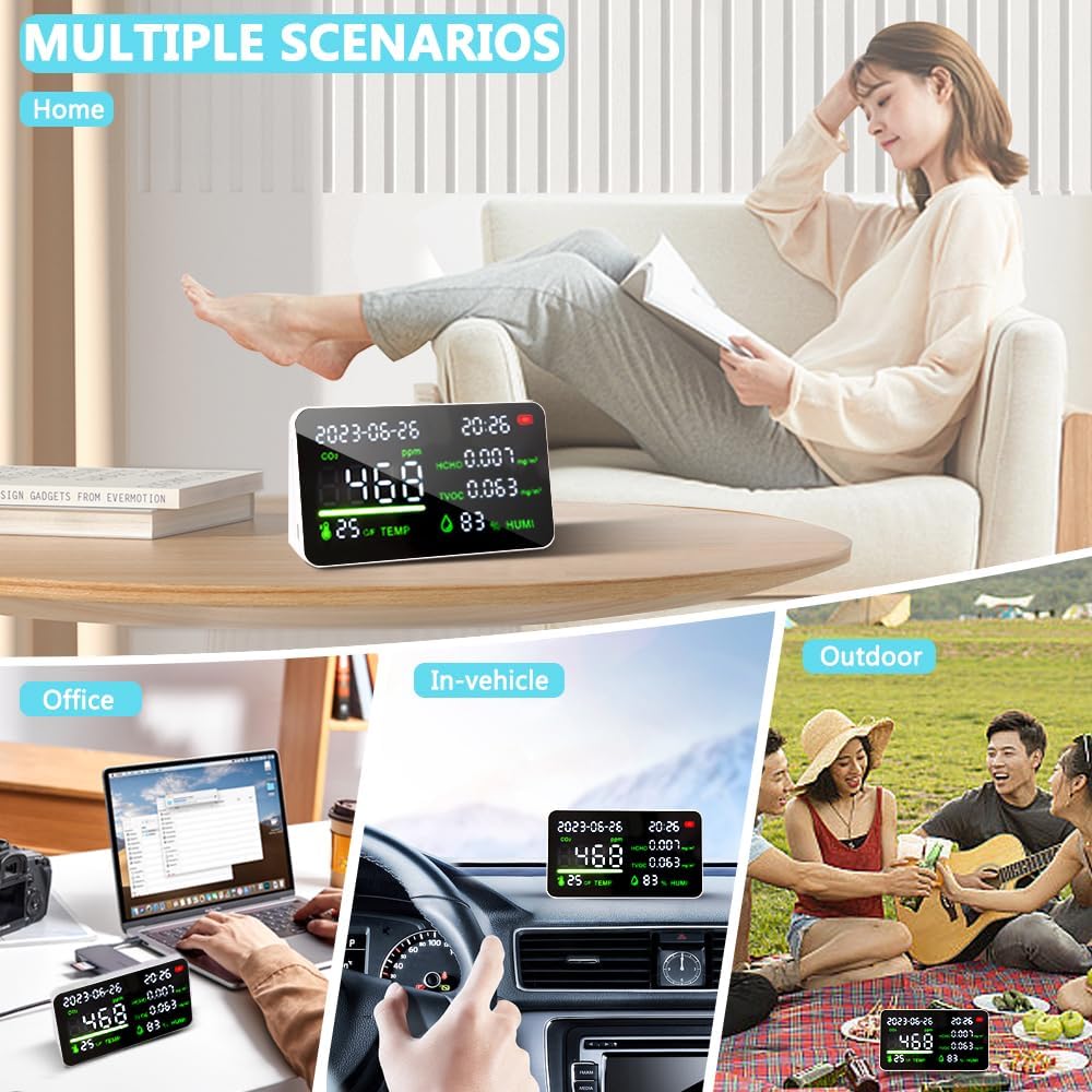 Accurate and Reliable--Thanks to advanced sensor technology, the air quality detector provides accurate readings of harmful pollutants like HCHO, VOCs, and CO2 levels in your home, giving you peace of mind about the air you breathe