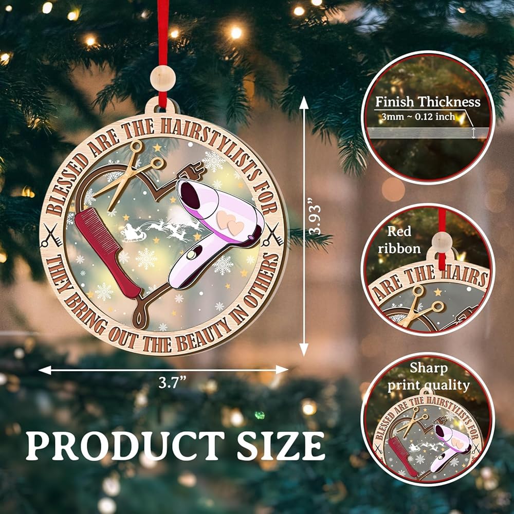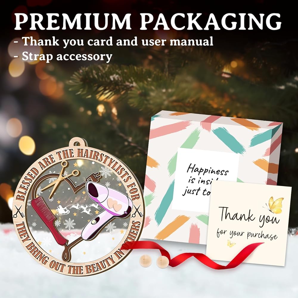 تشتمل المجموعة على: زينة عيد الميلاد الخشبية لمصفف الشعر مقاس 3.7 × 3.93 سم، وشريط لسهولة التعليق، وصندوق هدايا، مما يجعلها اختيارًا ممتازًا لهدايا مصفف الشعر للنساء أو التذكارات