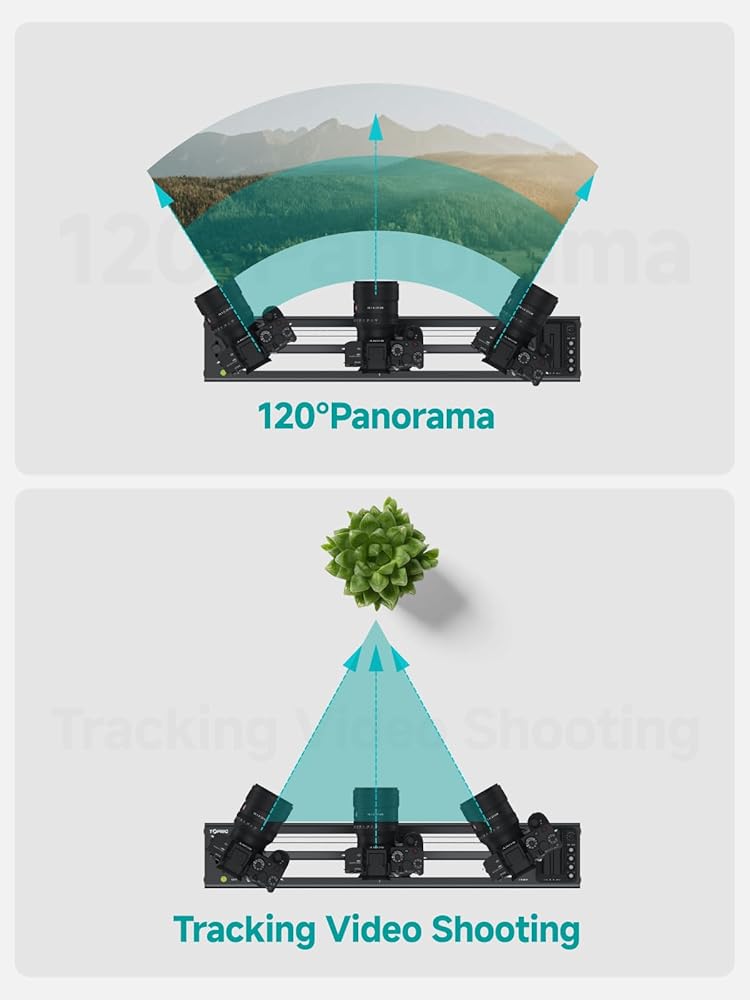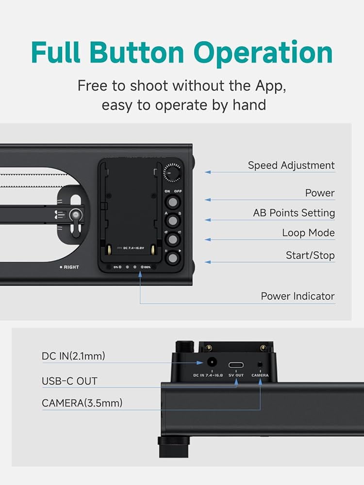 التحكم الكامل في الزر والتطبيق: تم تصميم شريط تمرير فيديو الكاميرا الخاص بنا بلوحة أزرار كاملة، والتي يمكن التحكم فيها من خلال التطبيق أو باليد. مقبض التحكم في السرعة يمكن بسهولة ضبط السرعة حسب الحاجة. يستغرق شريط التمرير الخاص بنا 12 ثانية فقط من التشغيل والمعايرة التلقائية