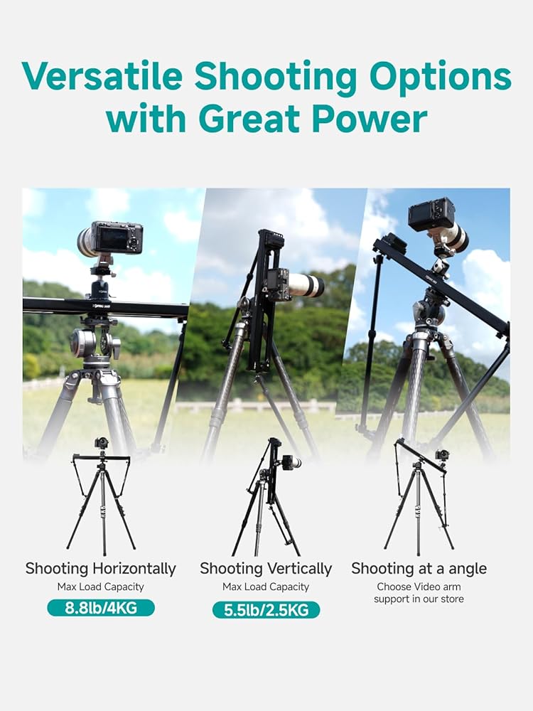 منزلق قوي: مصنوع من سبائك الألومنيوم، منزلق الفيديو هذا قوي ومتين. بغض النظر عن التصوير عن بعد أو تصوير الماكرو، يمكن أن يساعدك هذا المنزلق خفيف الوزن في تصوير فيديو أكثر استقرارًا وأكثر سلاسة ويمكنه تحمل حمولة 2.5 كجم رأسيًا و4 كجم أفقيًا.