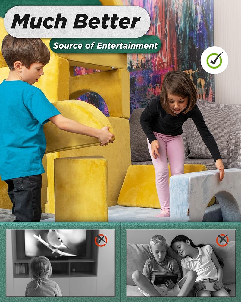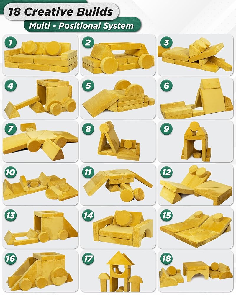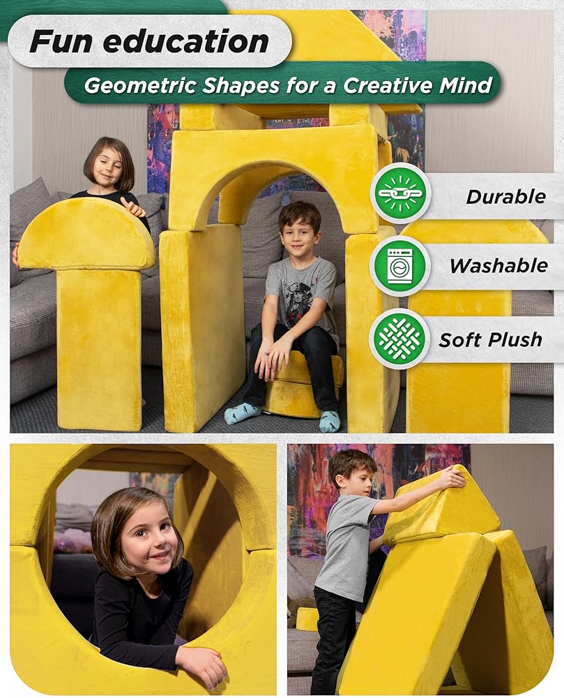أطفالك يستحقون الأفضل! أطلق العنان لإبداع أطفالك مع LX15 Modular Kids Play Couch. يتكون من نصفين مربعين مع نصفين دائرتين، ومثلثين، ودائرتين، ومنشورين مثلثيين، ومربعين، ومستطيلين. يمكن لهذه القطع الإسفنجية الـ 14 أن تصبح سيارة، أو خيمة، أو كنيسة، أو سكوتر، أو قلعة، أو زحليقة، أو أريكة، أو صالة سرير، أو أي شيء يمكن لأطفالك تخيله.