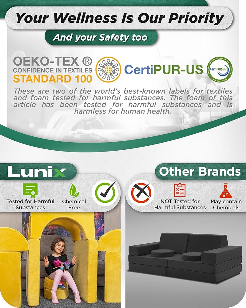 الهدية المثالية للأطفال! إذا كنت تريد هدية رائعة للأطفال الصغار، فسوف تحب أريكة الأطفال المعيارية LX15 المكونة من 14 قطعة. هذه الوسائد المريحة مثالية لمستكشفك الصغير، ويمكن للأطفال الكبار الاستمتاع بها أيضًا. سيوافق الآباء على الغطاء المخملي القابل للإزالة والغسل والذي يتميز بالنعومة والسلاسة على الجلد. يستخدم رغوة عالية الجودة وعالية الكثافة وآمنة لأطفالك. إن رغوة أريكة اللعب LX15 حاصلة على شهادة OEKO-Tex وCertiPUR-US وتم اختبارها لتكون خالية من أي مواد ضارة.