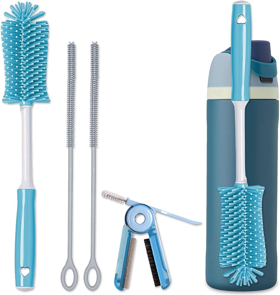 مجموعة فرش تنظيف السيليكون - فرشاة زجاجة مياه بمقبض طويل وفرشاة تنظيف شديدة التحمل، مجموعة تنظيف أكواب متعددة الأغراض 4 في 1 للترمس والزجاجات الرياضية وأكواب القهوة