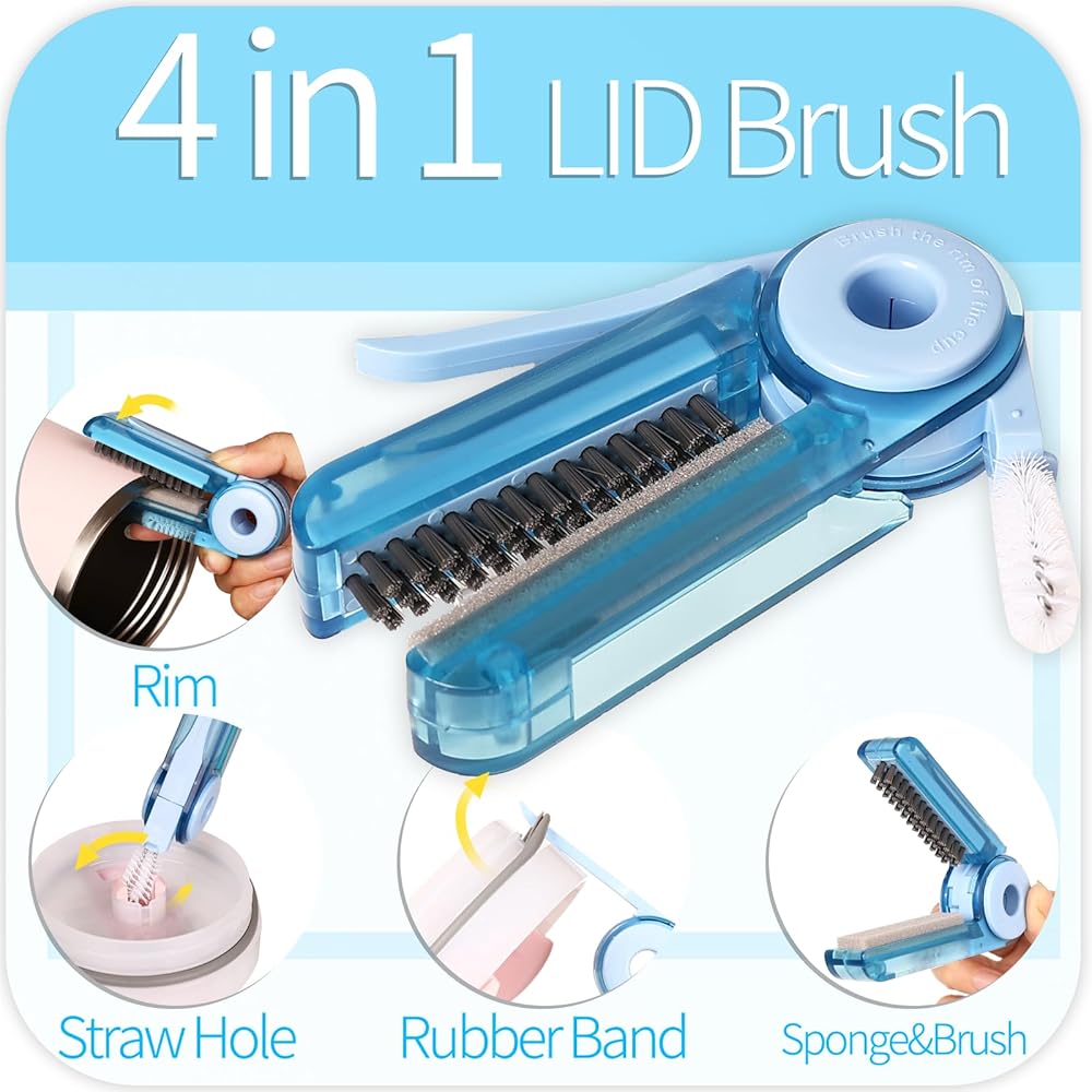 4-in-1 Multi-FunctionCleaning Brush- This portable tool combines four specialized brushes to keep your drinkware spotless anywhere: a.180° Spout Brush: Tackles stubborn stains around cup rims. b.Spiral Crevice Brush: Reaches narrow grooves inside lids. c.Stiff Corner Brush: Scrubs tight edges and grooves. d.Seal Lifter: Gently pries open rubber gaskets for deep cleaning.Compact and lightweight—fits easily in any bag. Ideal for home, travel, or outdoor use.