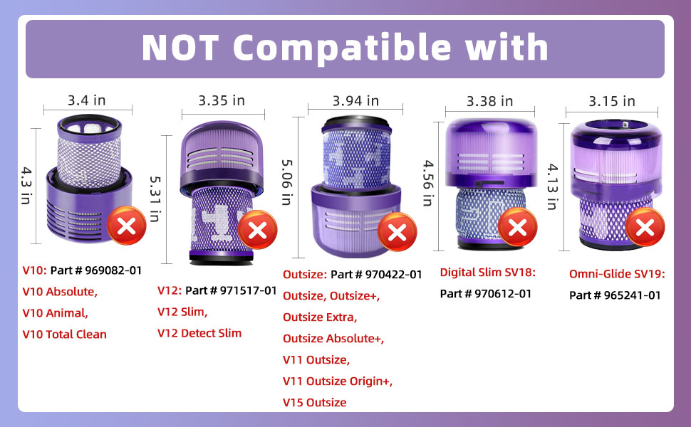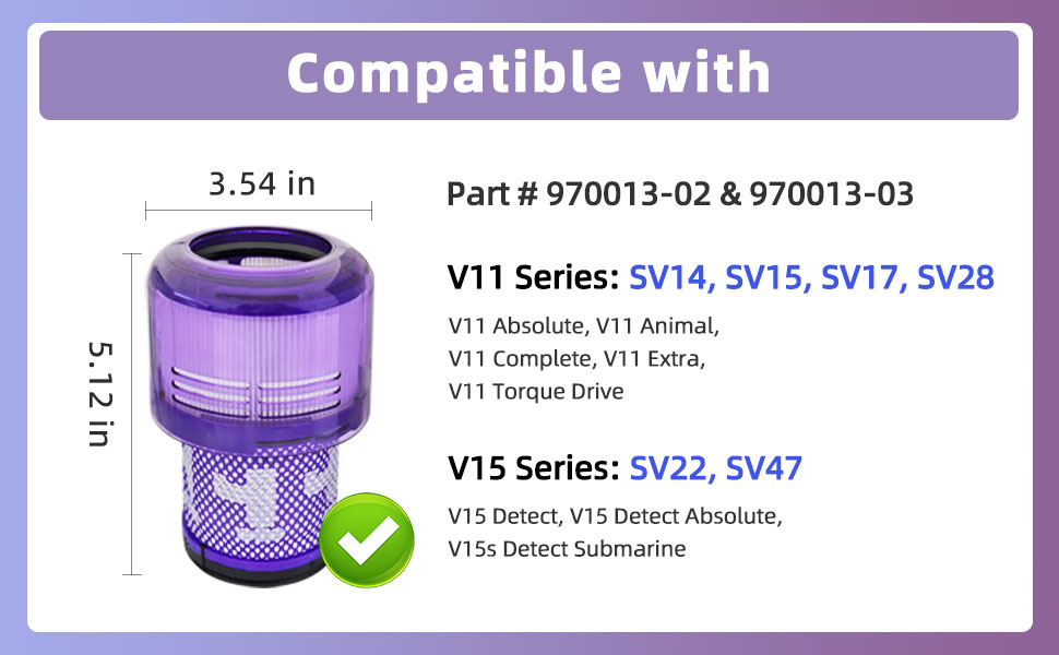 • ✅ نماذج متوافقة: ⭐ هذا جزء بديل متوافق مع طرف ثالث، وليس منتج OEM. يتوافق استبدال فلتر المكنسة الكهربائية هذا مع Dyson V11 Abstract، V11 Animal، V11 Complete، V11 Extra، V11 Torque Drive، V15 Detect، V15 Detect Abstract، V15s Detect Submarine، SV14، SV15، SV17، SV22، SV28، SV47. قارن مع الجزء رقم 970013-02 و970013-03.