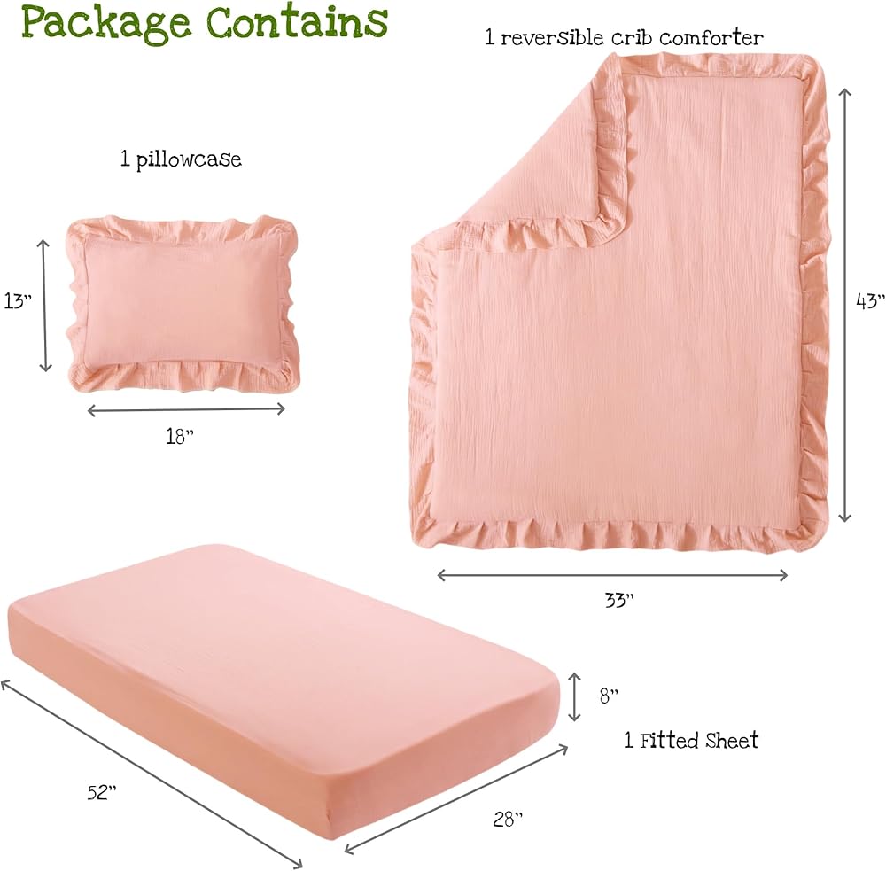 [العبوة] - 1 لحاف سرير مقاس 86.36 سم × 119.36 سم مع كشكشة مقاس 5.08 سم؛ 1 ملاءة جاهزة مقاس 28 بوصة × 52 بوصة + 8 بوصة تناسب مرتبة سرير الأطفال ذات الحجم القياسي: كيس الوسادة على شكل ظرف مقاس 13 بوصة × 18 بوصة لوسادة الأطفال القياسية، طقم سرير الأطفال المكون من 3 قطع يناسب معظم أغطية أسرة الأطفال. انظر إلى هذه الكشكشة الصغيرة اللطيفة! مثالية لطفلك