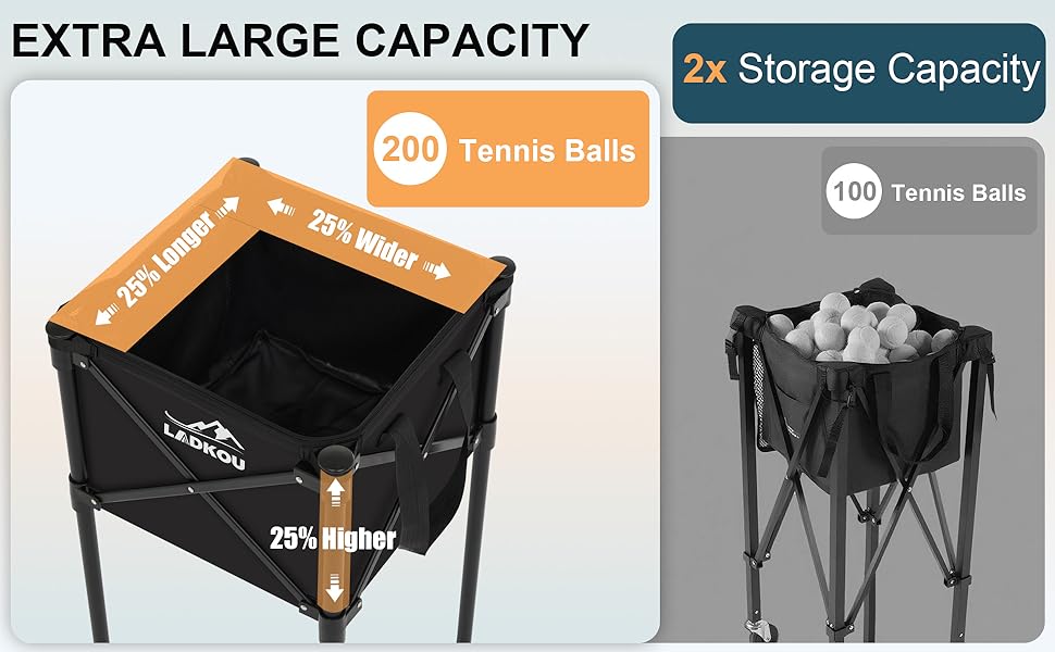【سعة 200 كرة، أكثر مرتين من غيرها】مع حقيبة ذات سعة كبيرة جدًا، يمكن لقادوس التنس الخاص بنا تخزين ما يصل إلى 200 كرة تنس أو 160 كرة مخلل، مما يجعلها مثالية للممارسات وجلسات التدريب والبطولات. تصميم السحاب لن يسمح للكرة بالسقوط. بالإضافة إلى ذلك، يتيح لك التصميم عالي الخصر الإمساك بالكرات بسهولة، دون الانحناء!