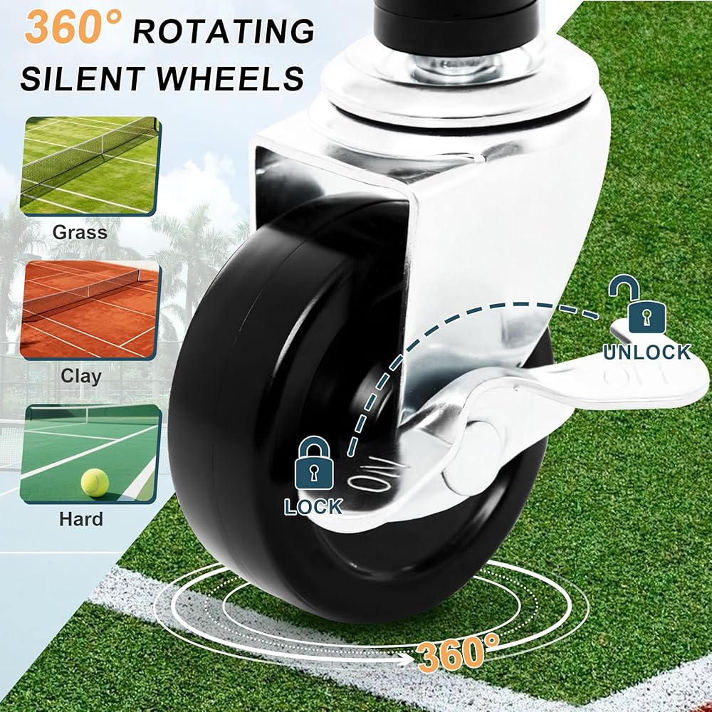 【حقيبة كرة قابلة للفصل وعجلات قابلة للقفل】استمتع بالاستخدام المرن مع حقيبة كرة قابلة للإزالة تعمل كحامل مستقل. تحرك بسلاسة عبر أي ملعب باستخدام أربع عجلات كبيرة دوارة بزاوية 360 درجة، تتميز اثنتان منها بأقفال فرامل مدمجة للحفاظ على قادوس كرة التنس مع العجلات في مكانها عند الحاجة.