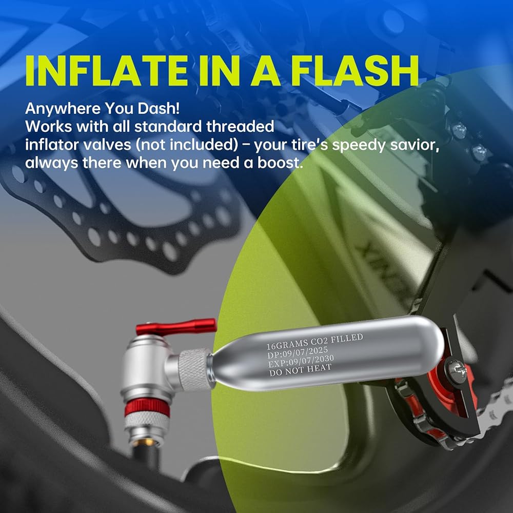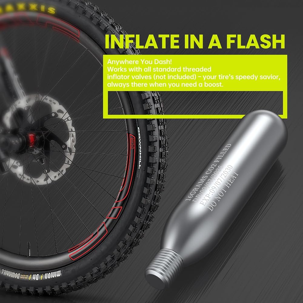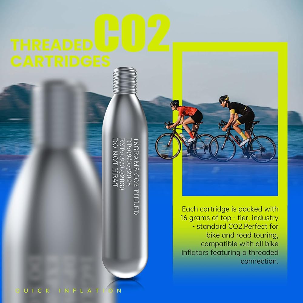 نفخ سريع وسهل للإطارات: توفر خراطيش ثاني أكسيد الكربون الملولبة بوزن 16 جرام نفخًا سريعًا وعالي الضغط - احصل على إطار دراجة على الطريق يصل إلى 130 رطل لكل بوصة مربعة أو إطار دراجة جبلية يصل إلى 42 رطل لكل بوصة مربعة في ثوانٍ معدودة. مثالية للإصلاحات السريعة على جانب الطريق أو الإصلاحات العاجلة في يوم السباق، مما يضمن عودتك إلى المسار أو الطريق دون تأخير.
