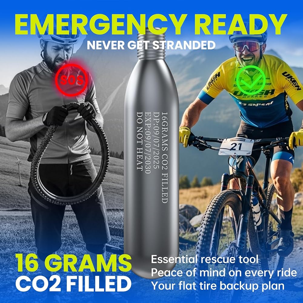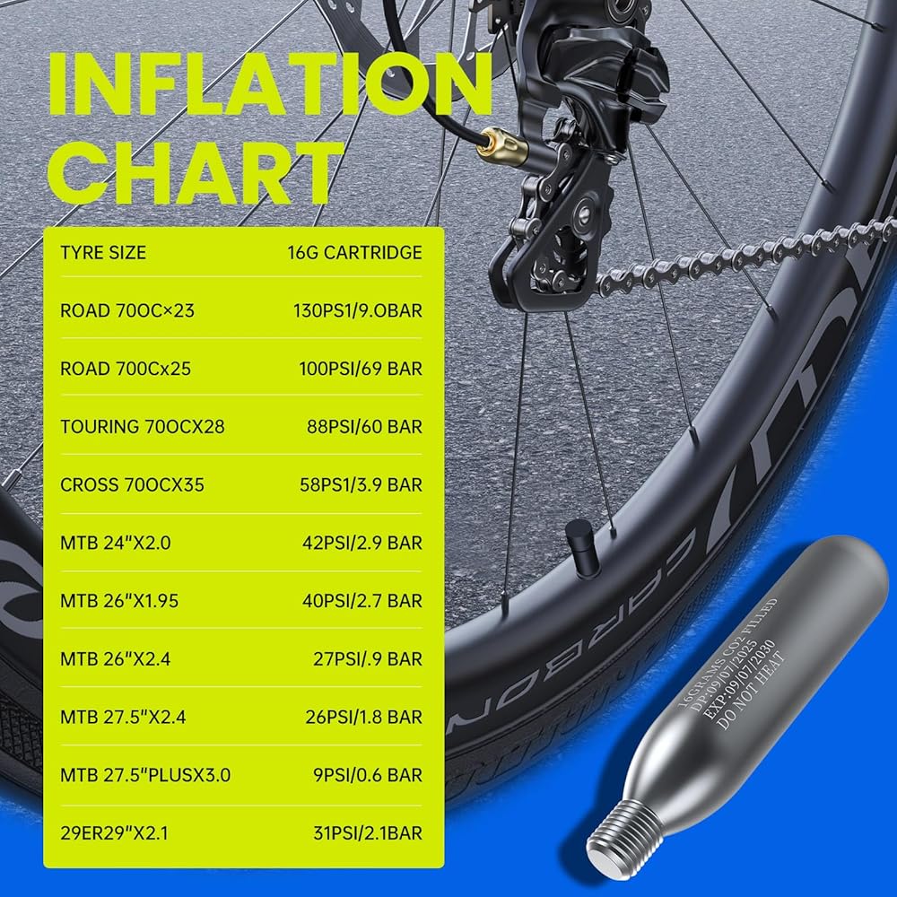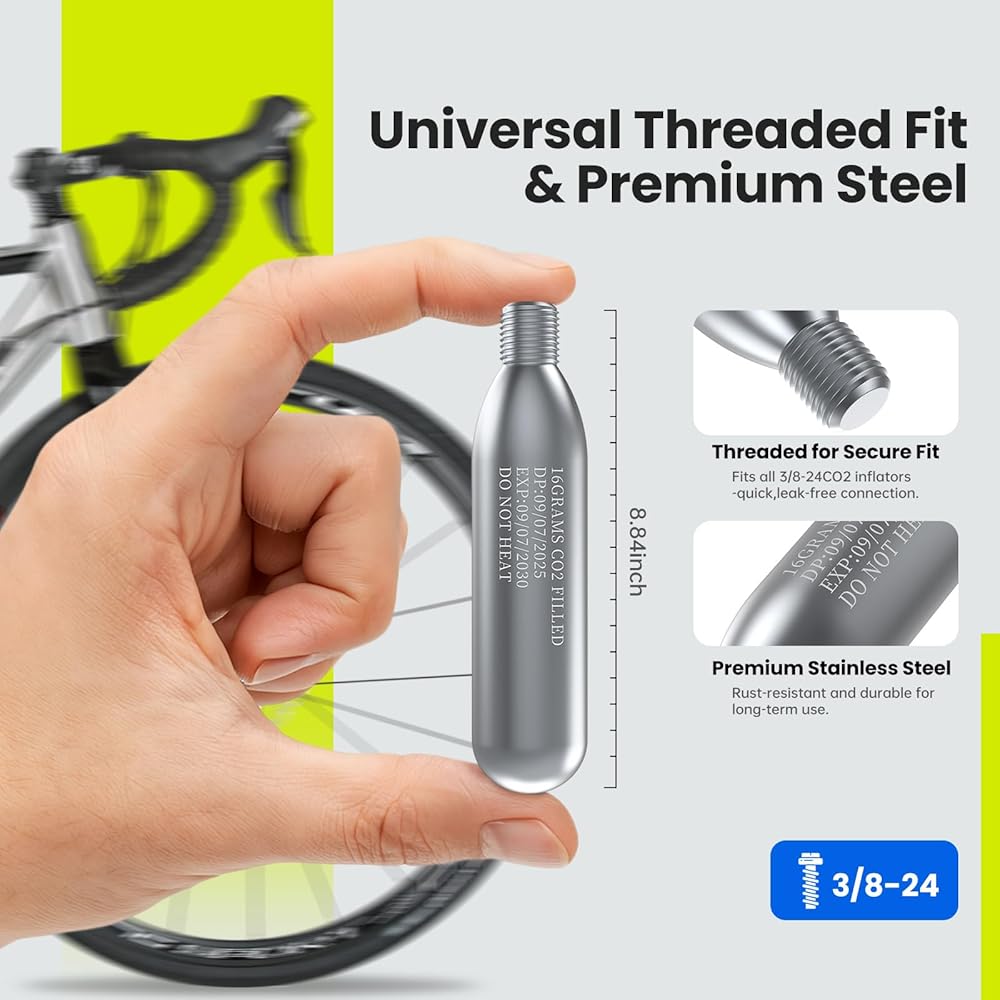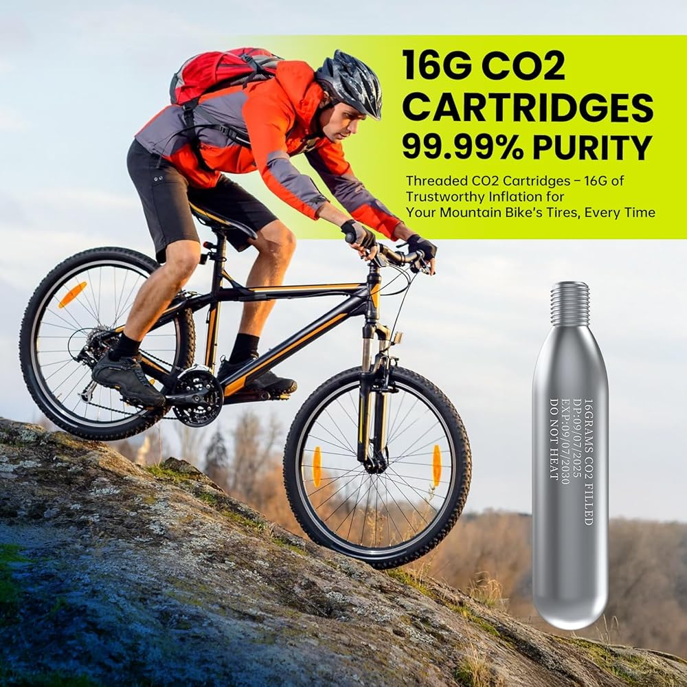 نفخ سريع وسهل للإطارات: توفر خراطيش ثاني أكسيد الكربون الملولبة بوزن 16 جرام نفخًا سريعًا وعالي الضغط - احصل على إطار دراجة على الطريق يصل إلى 130 رطل لكل بوصة مربعة أو إطار دراجة جبلية يصل إلى 42 رطل لكل بوصة مربعة في ثوانٍ معدودة. مثالية للإصلاحات السريعة على جانب الطريق أو الإصلاحات العاجلة في يوم السباق، مما يضمن عودتك إلى المسار أو الطريق دون تأخير.