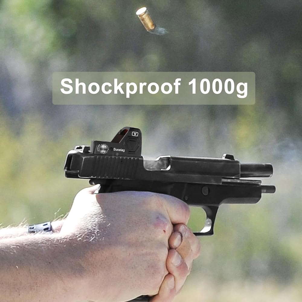 • 【مقاومة للصدمات 1000GS】مصنوعة من الألومنيوم المؤكسد بدرجة الطائرات، تتميز مشاهد النقطة الحمراء Suoeiag بمقاومة للصدمات تصل إلى 1000G، ومقاومة للماء IP65 والغبار والضباب مما يضمن المتانة وطول العمر، ويمكنها أيضًا تحمل الارتداد القوي.