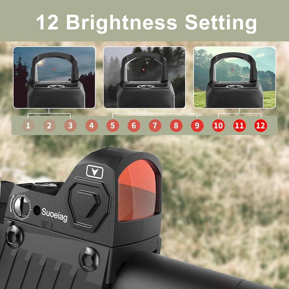 • 【إعدادات سطوع متنوعة 】لا يوفر مشهد النقطة الحمراء العاكسة الصغيرة Suoeiag فقط شبكاني 2MOA و12 مستوى من تعديل السطوع، ولكن أيضًا إعدادات الرياح/الارتفاع قابلة للتعديل بسهولة لتلبية احتياجاتك في ظروف مختلفة.
