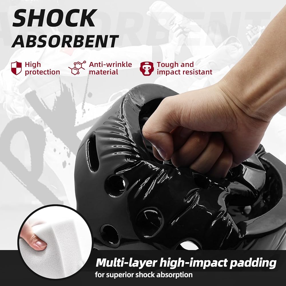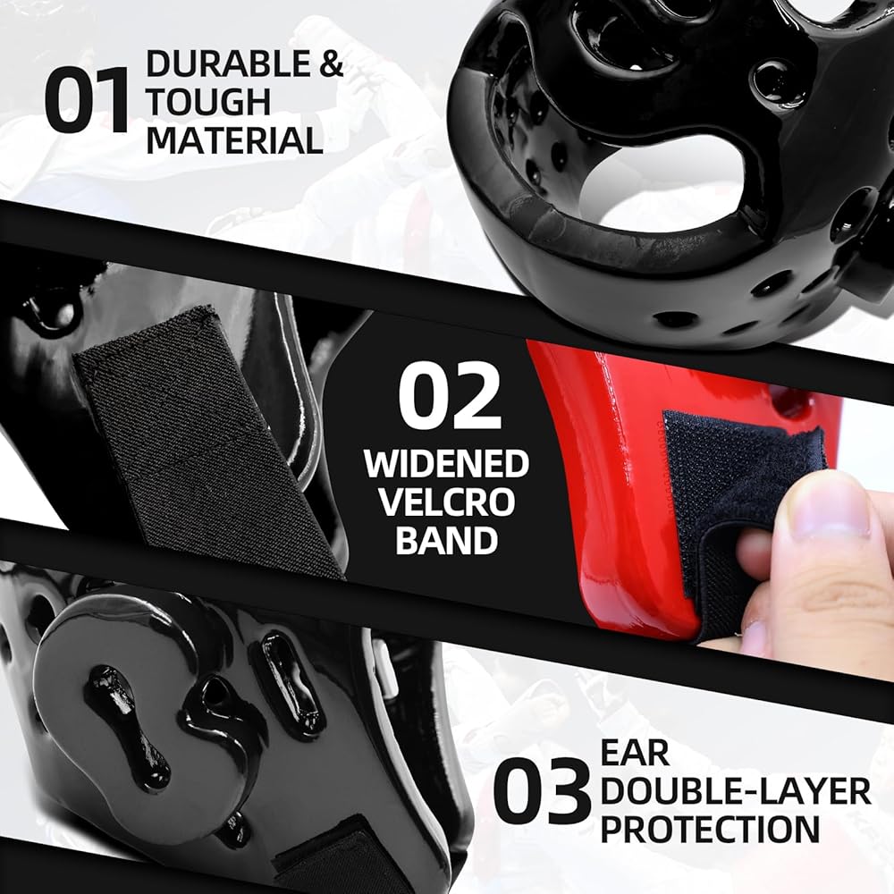 • ملاءمة آمنة وقابلة للتعديل: حزام فيلكرو سريع القفل مع إطار معزز يسمح بسهولة الارتداء والخلع وإحكام مخصص لجميع أحجام الرأس. يبقى ثابتًا أثناء السجال أو الركلات أو اللكمات - مثالي للمبتدئين والرياضيين المحترفين في الكاراتيه أو الملاكمة أو التايكوندو
