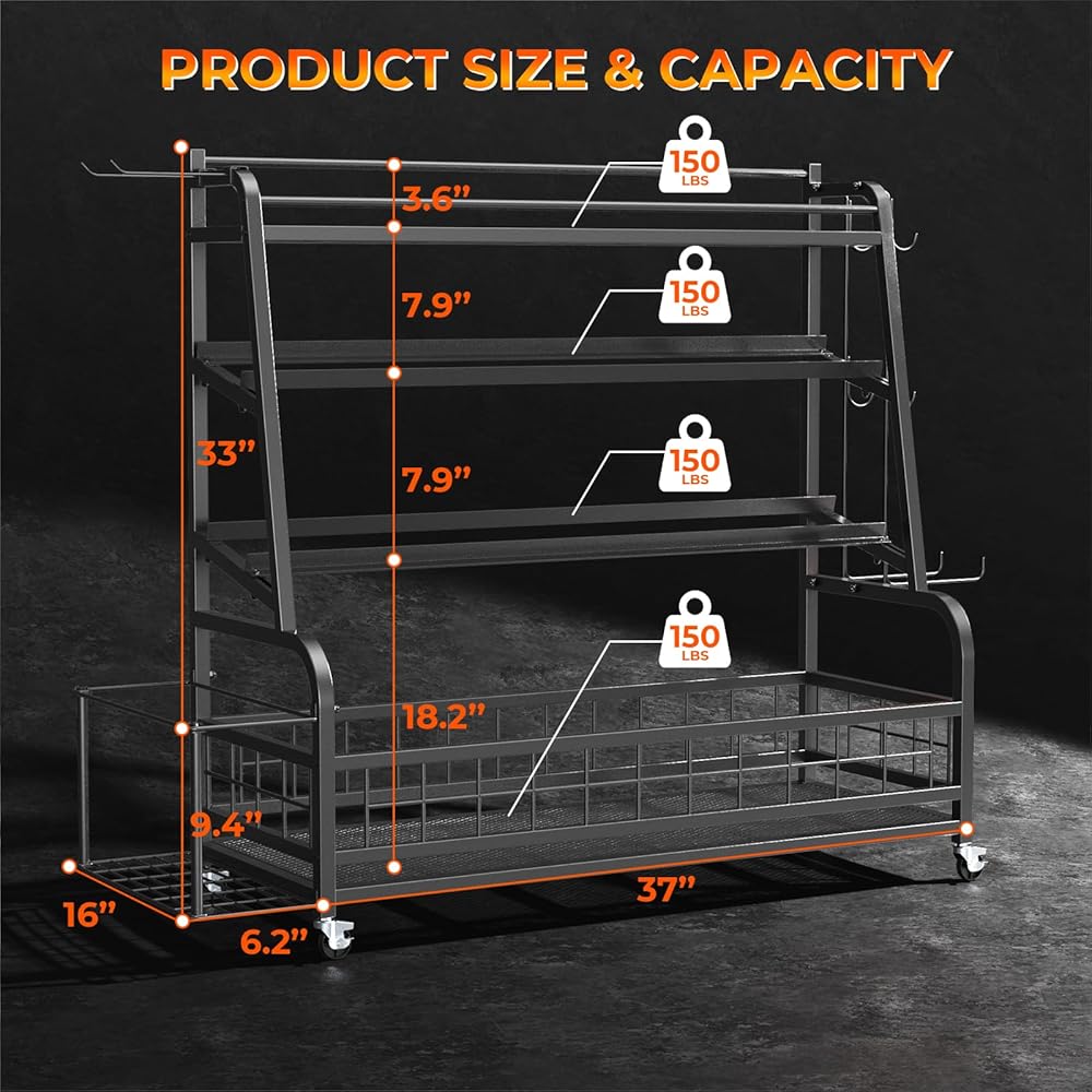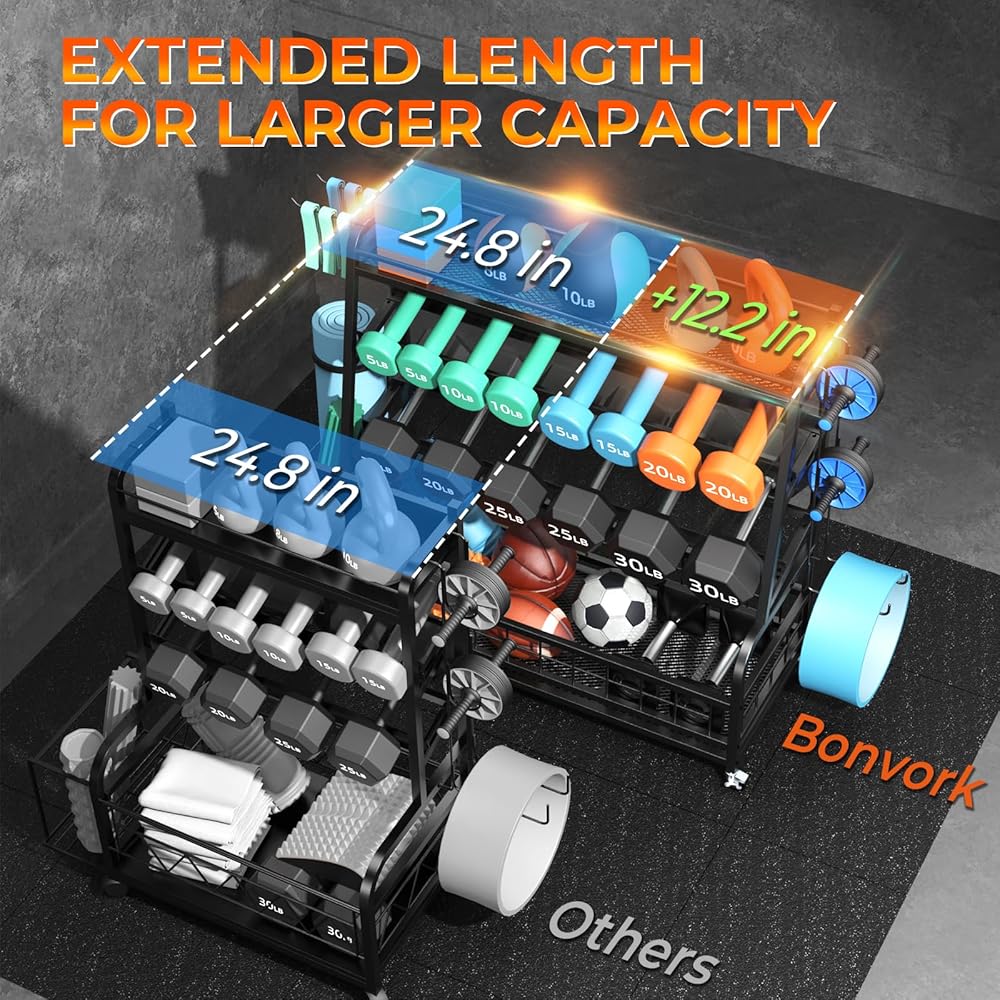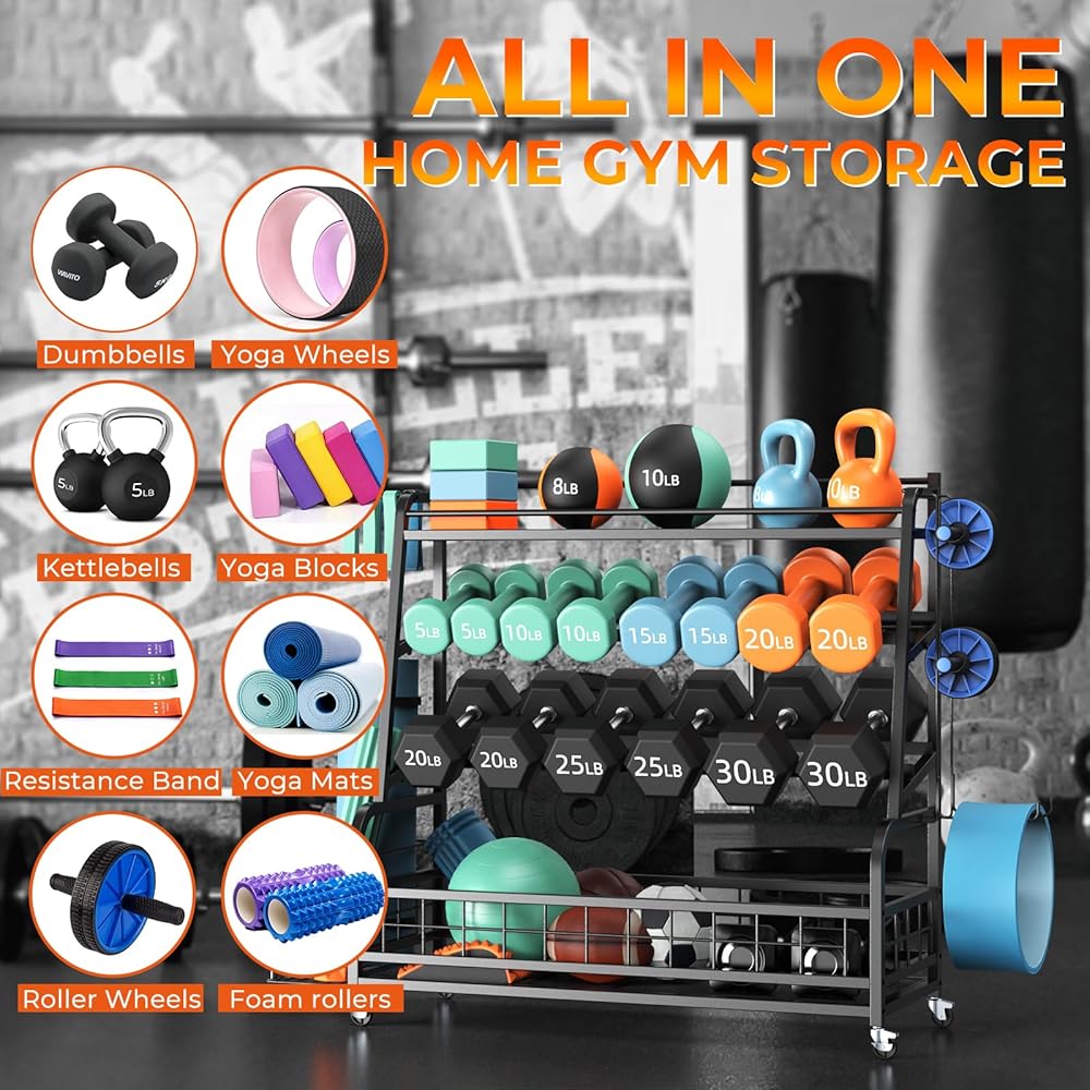 حامل وزن حامل الدمبل XL - حامل وزن قابل للتعديل للدمبل، رف تخزين صالة الألعاب الرياضية المنزلية لجرس كيتل بيل، الكرات، حامل تخزين بساط اليوجا، منظم تخزين معدات التمرين بعجلات
