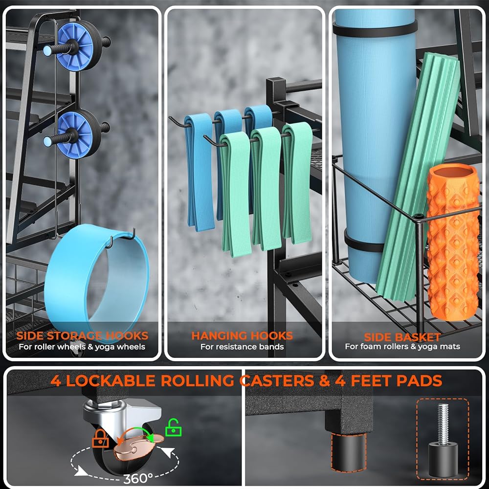 • 【حامل تخزين صالة الألعاب الرياضية المنزلي الكل في واحد】يتميز رف الأثقال هذا بتصميم متعدد الاستخدامات يجعله قادرًا على تخزين العديد من معدات الصالة الرياضية المنزلية مثل الطبقة الخشبية العلوية لأجراس الكيتل، ورف وزن من طبقتين للدمبل، وسلة جانبية لحصيرة اليوجا وبكرات إسفنجية، والعديد من الخطافات الجانبية لتخزين أشرطة المقاومة وأشرطة اللياقة البدنية والبكرات. كما أن سلة التخزين السفلية مثالية لتخزين الكرات ومكعبات اليوجا وغيرها من معدات التمرين لتخزين الكرات ومكعبات اليوجا وغيرها من معدات التمرين.