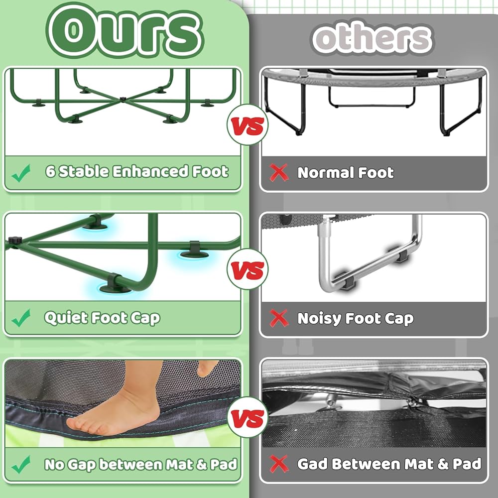 【ترقية الثبات】: يتم دعم الترامبولين الداخلي للأطفال من سن 2 إلى 5 سنوات بـ 6 أنابيب قدم على شكل حرف L، وهي ليست فقط ثابتة وليس من السهل قلبها، مع أقدام بلاستيكية غير قابلة للانزلاق، والهيكل ثابت ومشدود.