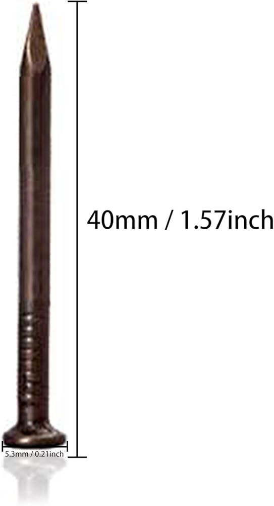 قطر رأس الأظافر من الفولاذ الكربوني (تقريبًا). : 5.3 مم / 0.21 بوصة ؛ الطول الإجمالي: 40 مم / 1.57 بوصة ؛ قطر العمود: 2.8 مم / 0.11 بوصة