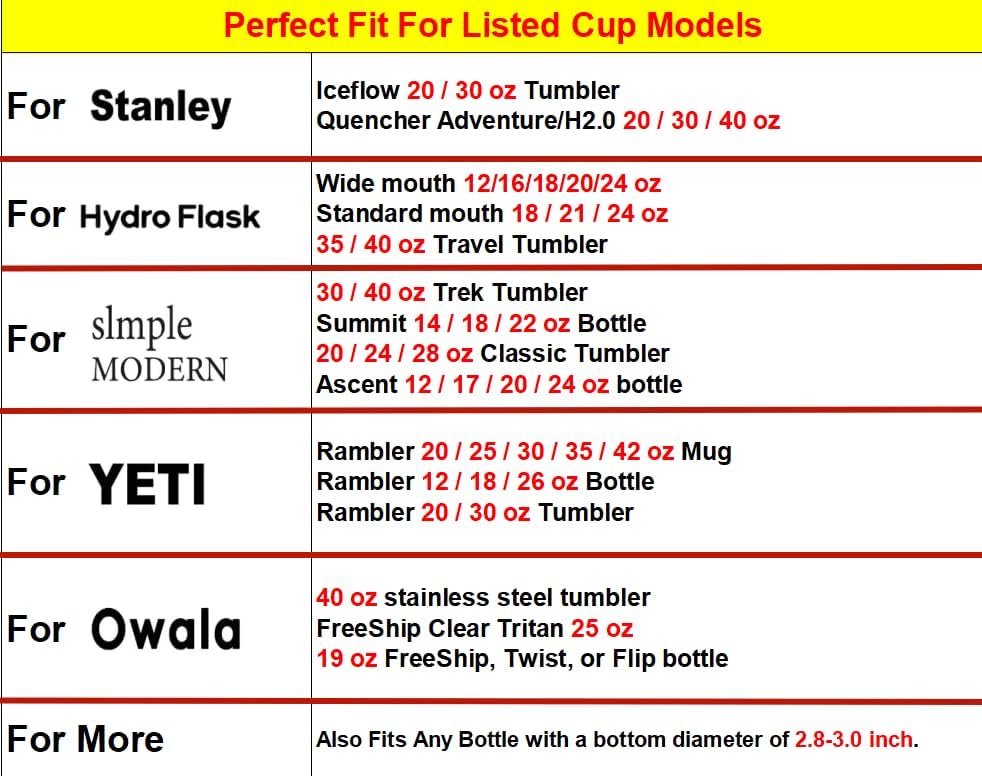 - مناسب تمامًا: مصمم خصيصًا لأكواب Stanley Quencher (30/40oz) H2.0، IceFlow (20/30oz). لإبريق الماء المسافر 40 أونصة، لكوب أوالا 40 أونصة، لقارورة مائية ذات فم واسع (12/16/18/20/24 أونصة)، للفم القياسي للقارورة المائية (18/21/24 أونصة)، لكوب ييتي رامبلر (20/30 أونصة)