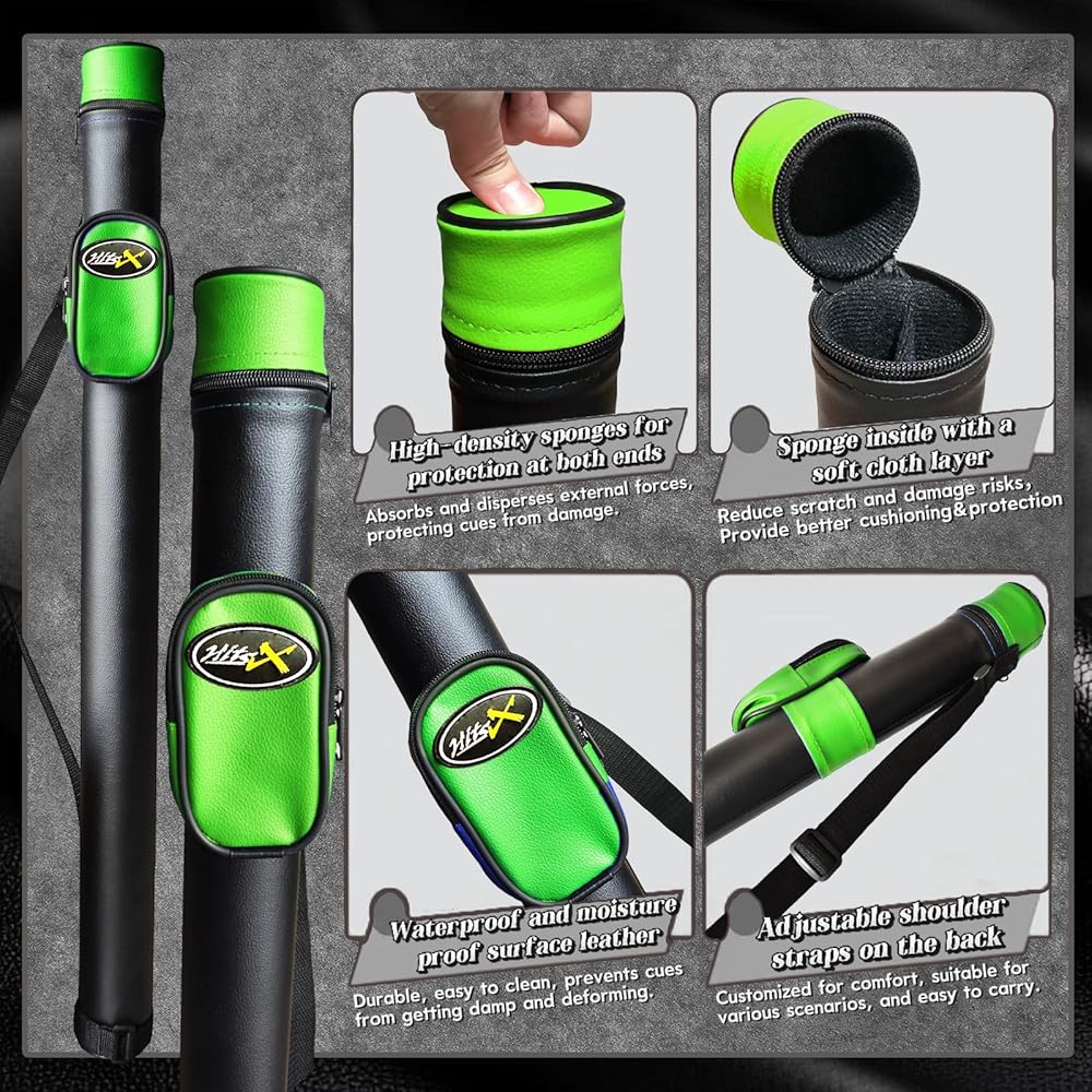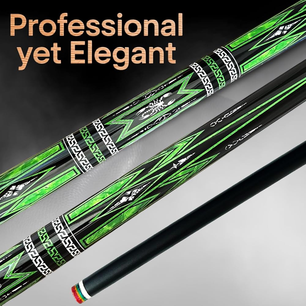 【All-in-One Premium Pool Set】Complete with 1 Professional Cue Stick, 1 Protective Case & 3 Essential Accessories. Perfect for Practice, Play, and Gifting. 【Specifications】Cue Length: 58 Inches (Tournament Standard); Tip: 13mm Multi-Layered Leather Tip for Enhanced Grip and Spin 【High-Performance Fiberglass Shaft】Experience superior control and accuracy. Our fiberglass shaft ensures efficient energy transfer, consistent elasticity, and rapid shape recovery. It offers outstanding durability, moisture resistance, and performs reliably in varying climates. 【Quick-Connect Joint】Easily assemble or disassemble your cue in seconds. Designed for convenience and portability without compromising stability. 【Premium Canadian Maple Butt】Crafted from A+++++ grade Canadian maple wood and finished with 10 layers of high-gloss varnish. This exquisite finish not only enhances the cue's appearance but also provides robust protection against warping and moisture. 【Protective Rubber Bumper】 Shield your cue from floor impacts and reduce wear. An essential detail for preserving the longevity and aesthetics of your cue.