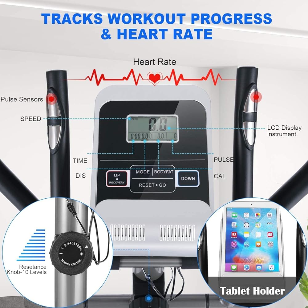 شاشة رقمية مفصلة: تعرض الآلة البيضاوية معلومات مفصلة في الوقت الفعلي عن المسافة والسرعة والسعرات الحرارية المحروقة والوقت والسرعة ودرجة حرارة الغرفة ومعدل ضربات القلب. يأتي مع حامل للكمبيوتر اللوحي حتى تتمكن من الترفيه أثناء التمرينات.