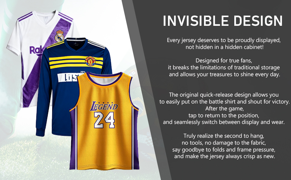 عرض غير مرئي لقمصانك: توفر شماعات الجيرسي الخاصة بنا مظهرًا نظيفًا بدون عرض. حافظ على التركيز على معداتك، وليس الأجهزة. تمنح علاقة الجيرسي قمصانك مظهرًا رائعًا عائمًا على الحائط، مما يجعلها عرضًا تذكاريًا نظيفًا.