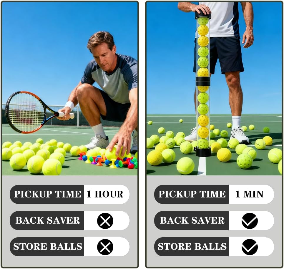 【التقاط الكرة بدون مجهود - لا حاجة إلى الانحناء】يتميز أنبوب مسترد التنس/كرة المخلل المطور بتصميم مريح للضغط لأسفل لجمع سريع من 15 كرة تنس أو 14 كرة مخلل. قلل من الانحناء لحماية ظهرك وركبتيك - مثالي للتمرين الفردي أو جلسات التدريب الجماعية.