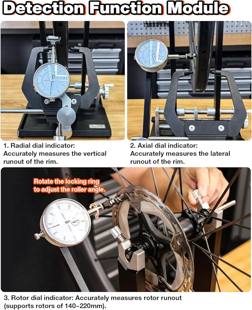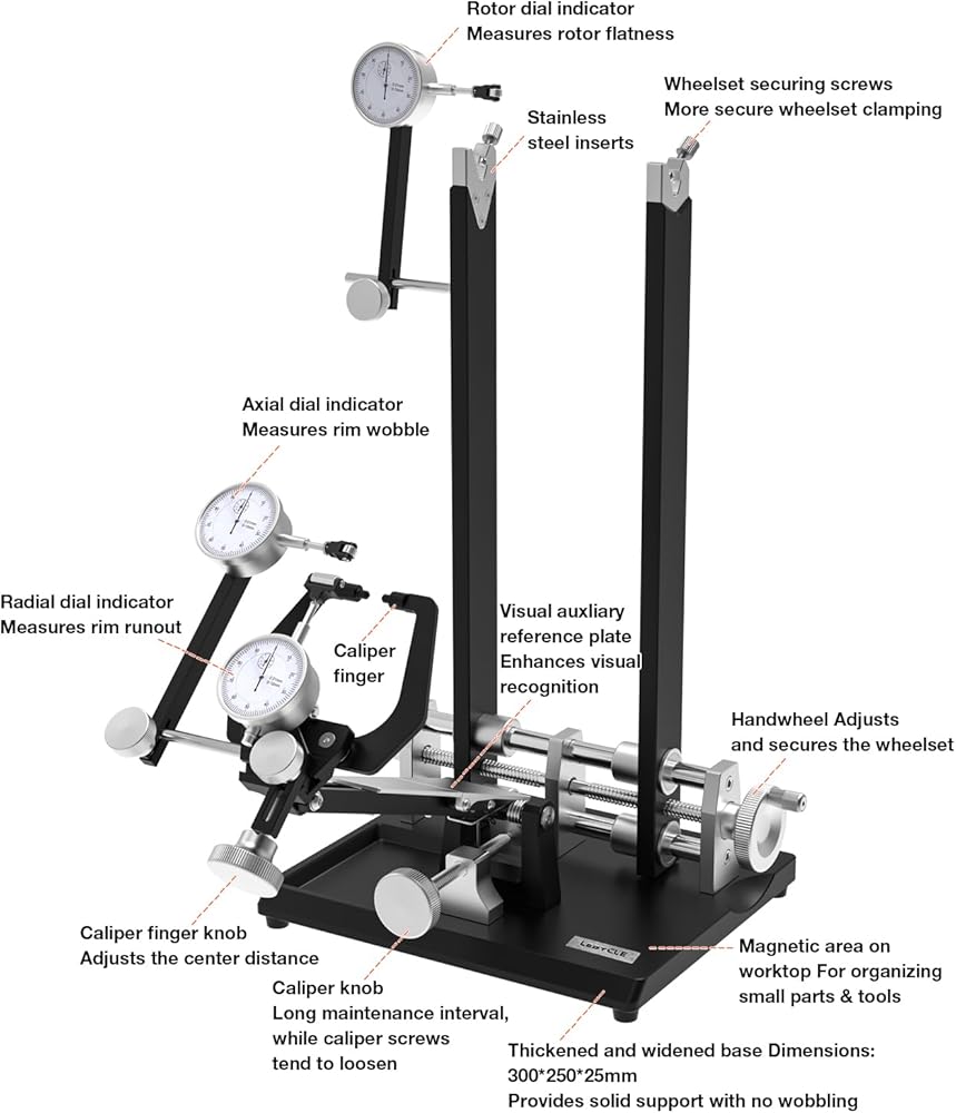 قياس دقيق للعجلة: مجهزة بمؤشرات قرصية معيارية للتشغيل الشعاعي والمحوري والدوار، مما يسمح بقياس دقيق لقفزات الحافة والتذبذب ومحاذاة القرص. مثالية لبناء العجلات الاحترافية وتصحيحها