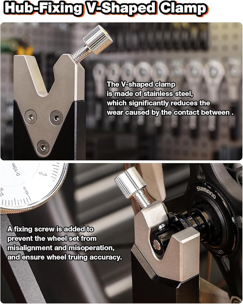مشابك محورية متينة: مشابك محورية من الفولاذ المقاوم للصدأ على شكل حرف V تقلل من التآكل أثناء الإمساك بالعجلة بقوة. توفر البراغي الطرفية الإضافية أمانًا إضافيًا لجلسات الإصلاح الطويلة في ورش العمل أو متاجر الدراجات