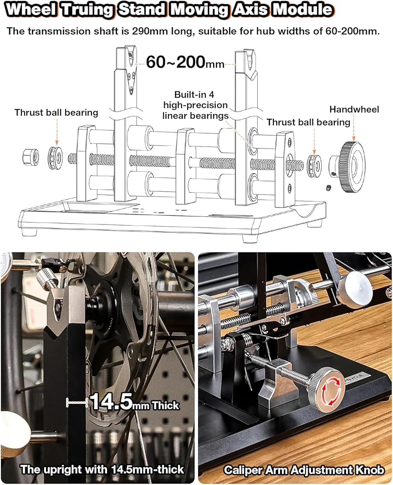 توافق واسع: يدعم تباعد المحور من 60-200 مم ويناسب عجلات 12/14/16/18/20/22/24/26/27.5/29/451/650/700C. مثالية لإعدادات حامل عمل الدراجة في محلات الإصلاح الاحترافية أو فرق السباق أو ورش العمل المنزلية