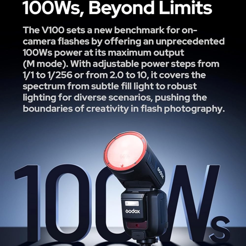 100Ws and 70 Full-Power Consecutive Flashes: The Godox V100S Flash sets a new benchmark for on-camera flashes by offering an unprecedented 100Ws power at its maximum output(M mode). With adjustable power steps from 1/1 to 1/256 or from 2.0 to 10. Thanks to its advanced cooling system, the V100-S delivers 70 to 100 consecutive flashes at 100Ws without compromising performance