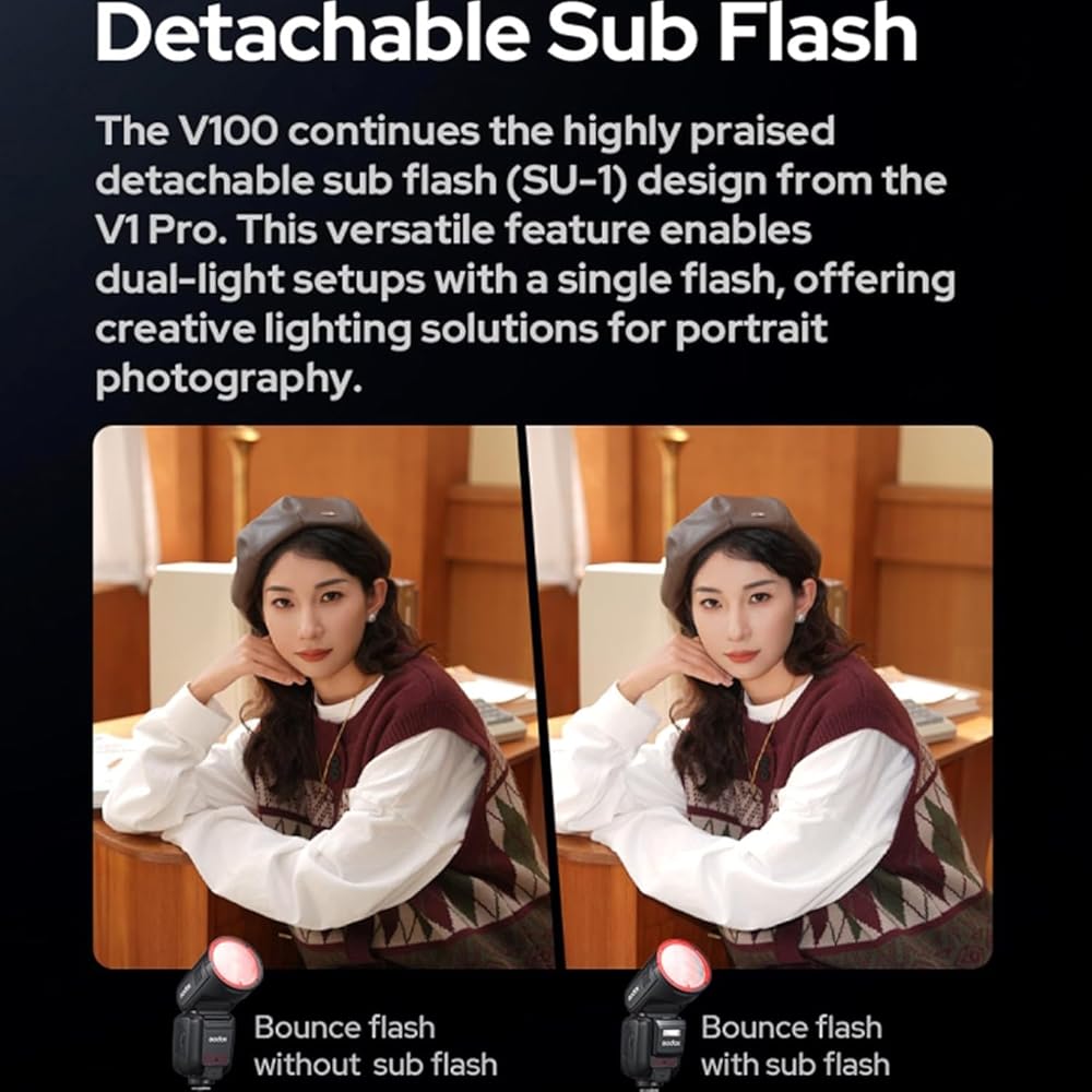 Detachable Sub Flash: The V100S continues the highly praised detachable sub flash (SU-1) design from the Godox V1ProS. This versatile feature enables dual-light setups with a single flash, offering creative lighting solutions for portrait photography