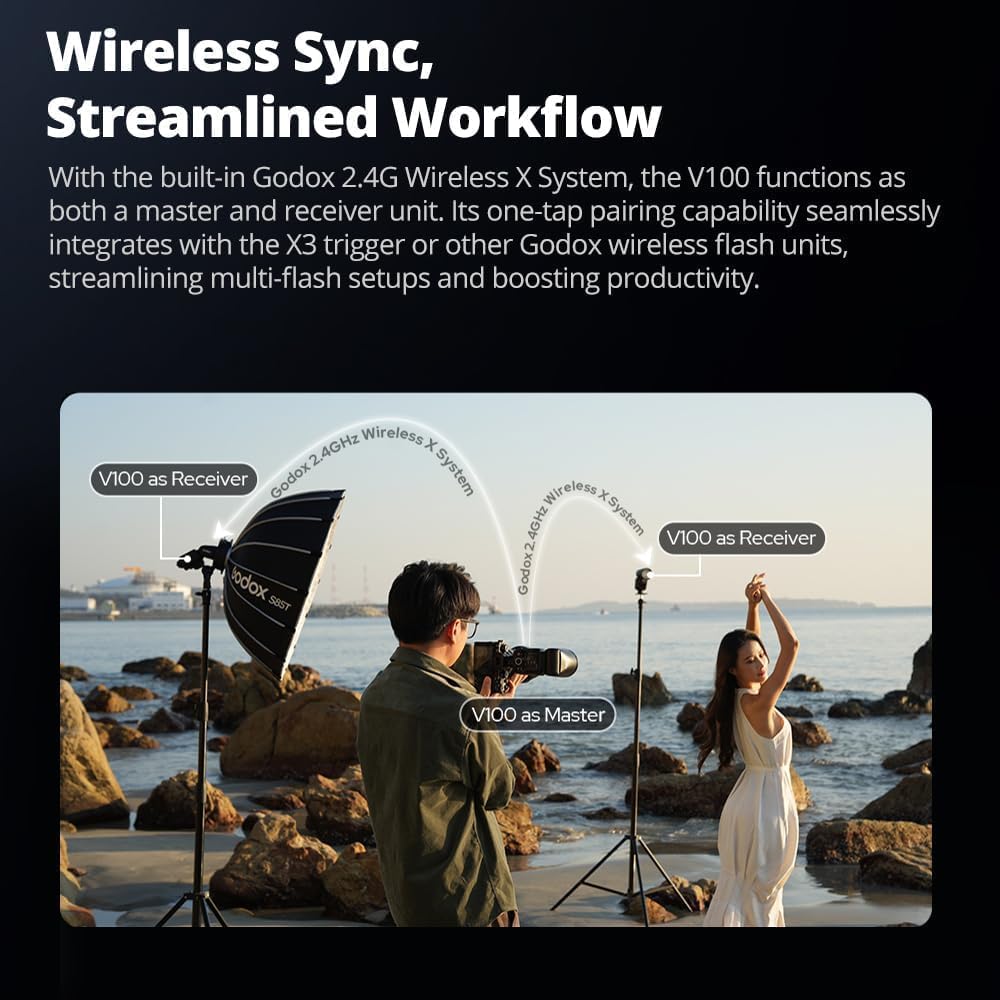 Wireless Sync, Streamlined Workflow: With the built-in Godox 2.4G Wireless X System, the V100-S functions as both a master and receiver unit. Its one-tap pairing capability seamlessly integrates with the X3 trigger or other Godox wireless flash units, streamlining multi-flash setups and boosting productivity