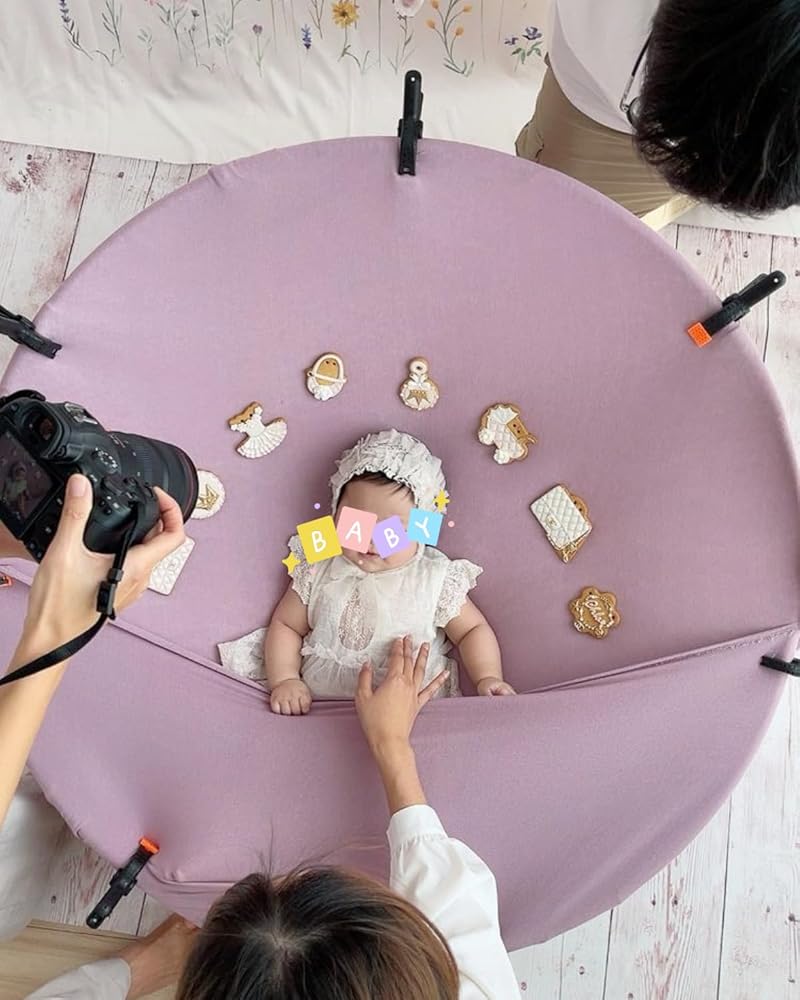 • مرونة الوضع 360 درجة - أفضل جزء في حامل الخلفية هذا هو شكله الدائري - وهذا يسمح لك بإظهار خلفيتك خلف الطفل بغض النظر عن زاوية الكاميرا التي تستخدمها. اقلب كيس القماش نحو الضوء، وستظل خلفيتك مثالية - يمكنك تصوير الجزء العلوي من رأسها، وقم بتدوير الكيس لرؤية أطراف أصابع قدميها، ولن تضطر إلى تعديل الخلفية لاحقًا.