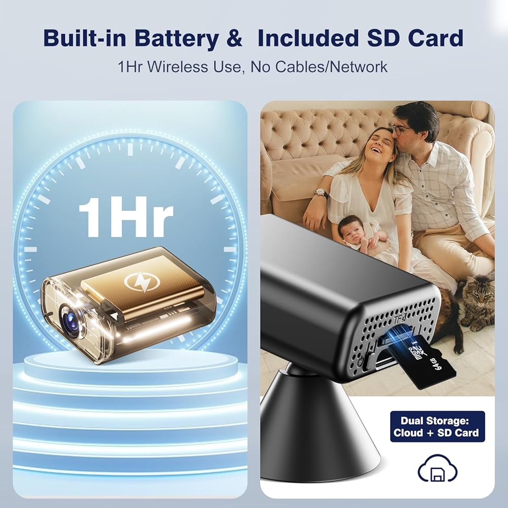 • بطارية قابلة لإعادة الشحن وسهلة الإعداد‌: تعمل بشكل مستمر مع كابل USB قوي، مما يوفر أمانًا متواصلًا (يوصى باستخدامه مع مصدر الطاقة). تتضمن بطارية ليثيوم قابلة لإعادة الشحن توفر ما يصل إلى ساعة واحدة من الاستخدام المستقل لكل شحنة. تتيح القاعدة القابلة للدوران بزاوية 360 درجة والجزء الخلفي اللاصق 3M إمكانية التثبيت السريع على الحائط/سطح المكتب - دون الحاجة إلى الحفر أو الأسلاك. النشر خلال 15 ثانية فقط