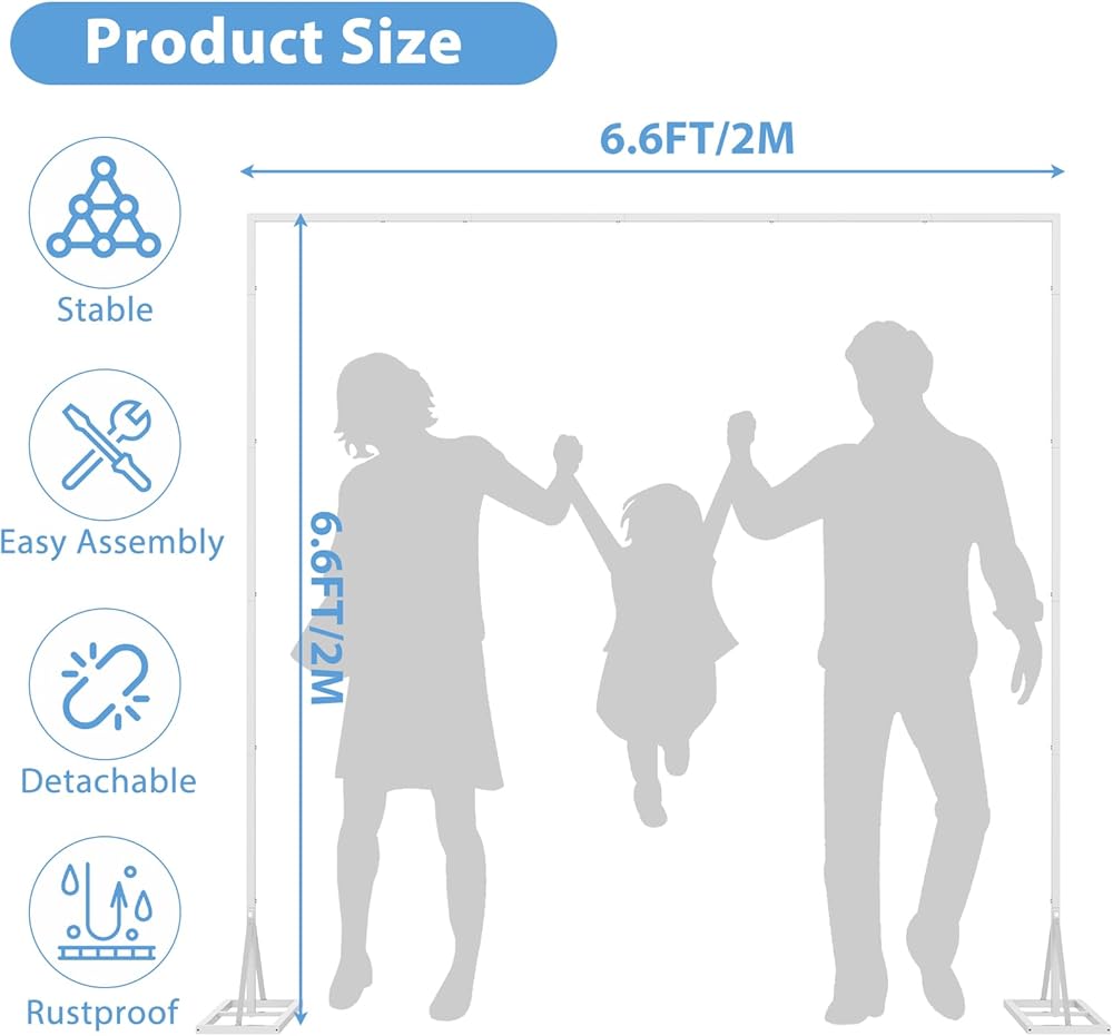 قوس زفاف مربع بطول 6.6 قدم: يوفر حامل الخلفية المربع هذا تصميمًا مربعًا واسعًا ومتناسقًا، يبلغ قياسه 8 أقدام في الارتفاع والعرض. توفر أبعادها الأنيقة خلفية كبيرة ومتوازنة للاحتفالات والصور والإعدادات الزخرفية دون إرباك مساحتك.