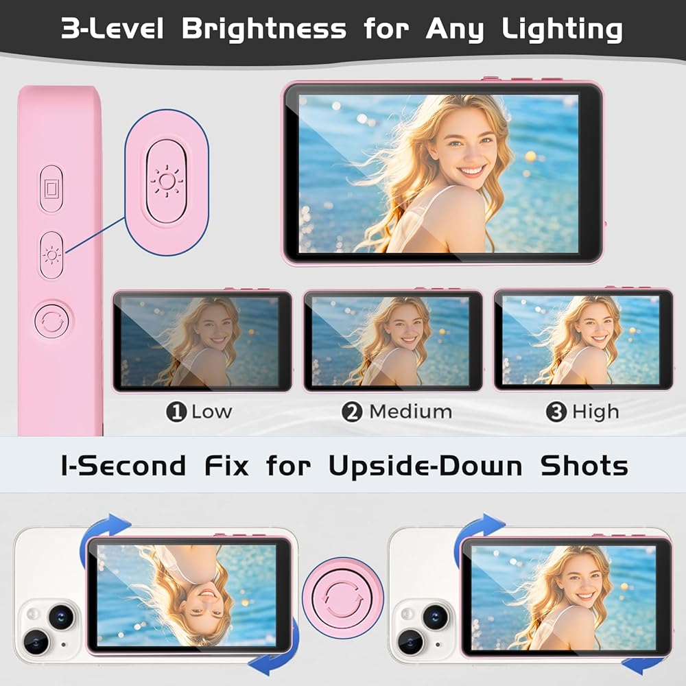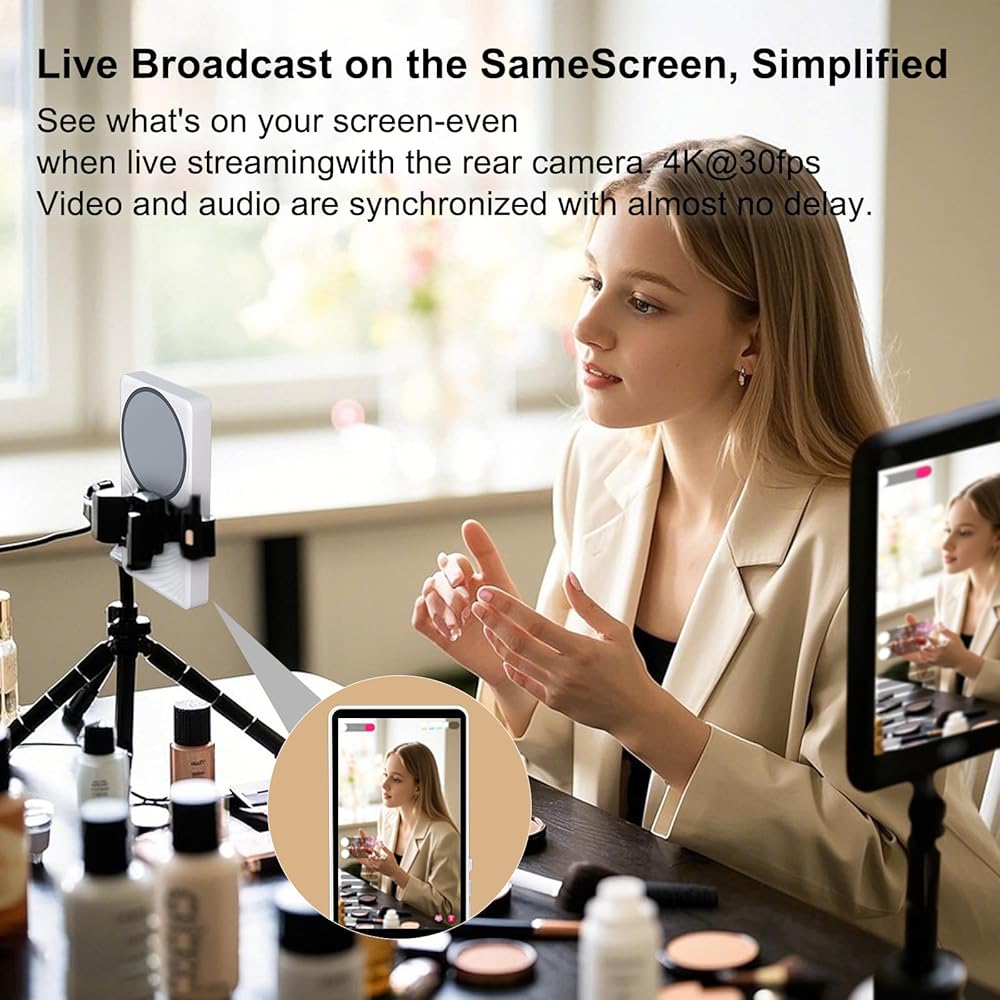 • 【شاشة كاميرا خلفية في الوقت الحقيقي】شاشة سيلفي لمدونة الفيديو، شاشة كاميرا خلفية عن بعد، لمزامنة عرض الكاميرا الخلفية لهاتفك على الفور من خلال وظيفة النسخ المتطابق للشاشة. بالمقارنة مع الأجهزة الأخرى، يدعم هاتف الشاشة الخاص بنا التسجيل اللاسلكي بدقة 4k بمعدل 24 إطارًا في الثانية و30 إطارًا في الثانية و60 إطارًا في الثانية من خلال سلسلة iPhone 12 وما فوق. قل وداعًا للقطات الكاميرا الأمامية الباهتة وزوايا الكاميرا الخلفية غير الملائمة، مما يجعل إنشاء المحتوى أسهل وأكثر احترافية. التقط صور سيلفي ومدونات فيديو وبث مباشر ومحتوى مثالي لمنصات مثل TikTok وInstagram وYouTube في أي وقت وفي أي مكان.