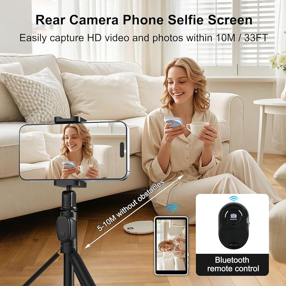 • 【جهاز تحكم عن بعد بطول 33 قدمًا】جهاز تحكم عن بعد يعمل بتقنية البلوتوث بطول 33 قدمًا: تشتمل شاشة شاشة الصور الشخصية الخاصة بنا على جهاز تحكم عن بعد يعمل بتقنية البلوتوث. يتمتع جهاز التحكم عن بعد اللاسلكي بمدى يصل إلى 33 قدمًا، والذي يمكن توصيله بسلاسة بهاتفك الذكي، مما يوفر اتصالاً موثوقًا ومستقرًا. لا مزيد من القلق بشأن فقدان الإشارة أو التعرض للتأخير، مما يمنحك حرية التقاط اللقطة المثالية من مسافة بعيدة. لا مزيد من امتدادات الذراع المحرجة أو صور السيلفي المتسرعة!