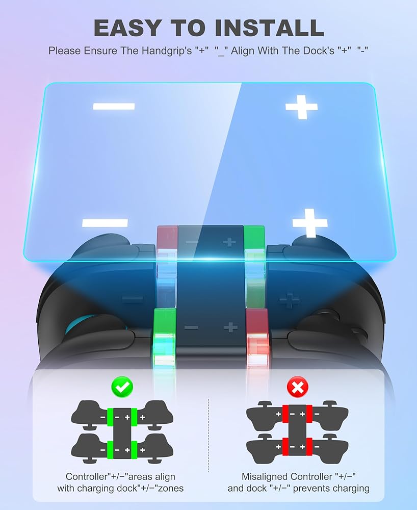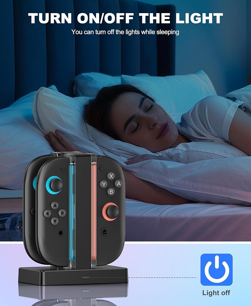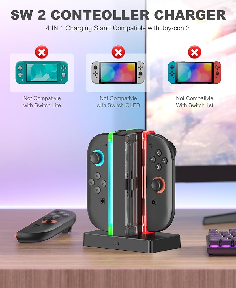• 【قاعدة شحن سويتش 2 متوافقة مع وحدة التحكم جويكون 2】محطة شحن سويتش 2 بتصميم بسيط يجعلها ممتعة من الناحية الجمالية وعملية، تشحن 4 وحدات تحكم في 3 ساعات. مثالية للعب اللعبة مع أصدقائك والاستمتاع بوقت اللعب بشكل كامل