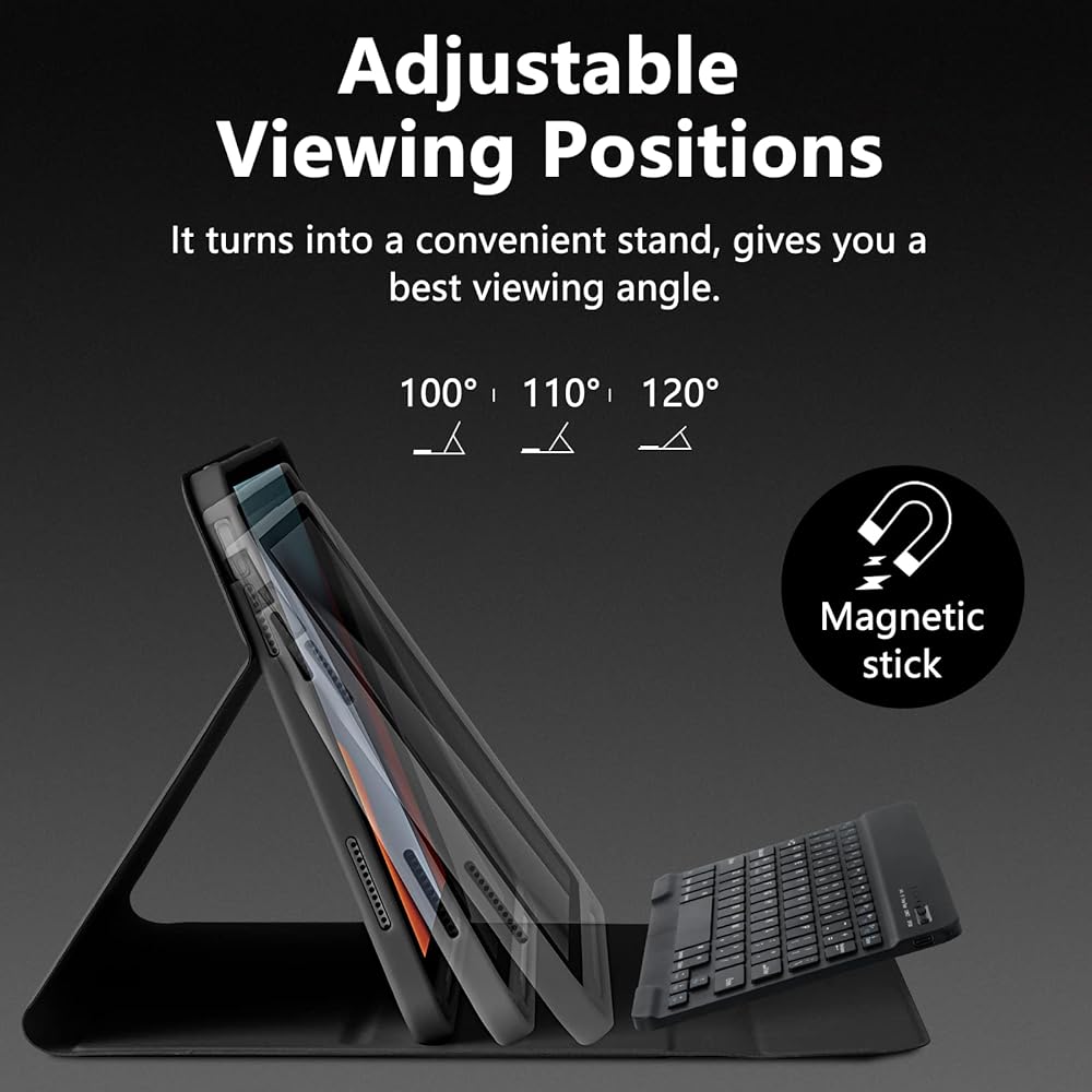 【تصميم متعدد الزوايا】: تتميز حافظة iPad A16 هذه المزودة بلوحة المفاتيح بثلاثة أخاديد مصممة بدقة تسمح لك بضبط زاوية عرض جهاز iPad الخاص بك في الوضع الأفقي لكتابة أو مشاهدة مريحة، ويناسب هذا التصميم زوايا الرؤية المختلفة للمستخدمين من جميع الأعمار. تضمن هذه الأخاديد أيضًا بقاء جهاز iPad الخاص بك ثابتًا أثناء الاستخدام، مما يمنع أي تذبذب. توفر فتحة القلم المصممة بعناية في الجزء السفلي من الحافظة مساحة تخزين مريحة لقلم Apple الخاص بك لمنع فقدانه.